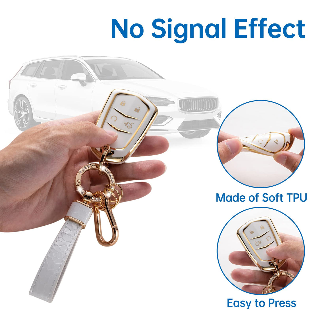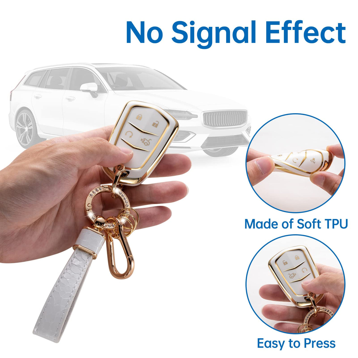 Key Fob Case for Cadillac Escalade CTS SRX XT5 ATS CT6 5 Buttons Smart Remote Key with Pearl Keychain Lanyard Color: White & Gold Material: Premium TPU Package Include: 1 * Soft TPU Key Protector for Cadillac(Note: NOT included the car key) 1 * Metal Circle Ring Clip with 3 Rings 1 * Metal D-buckle 1* Metal Carabiner Clip 1*Shiny Keychain Lanyard 1 * Screwdriver (Please keep them, you will need them to take out the keys)