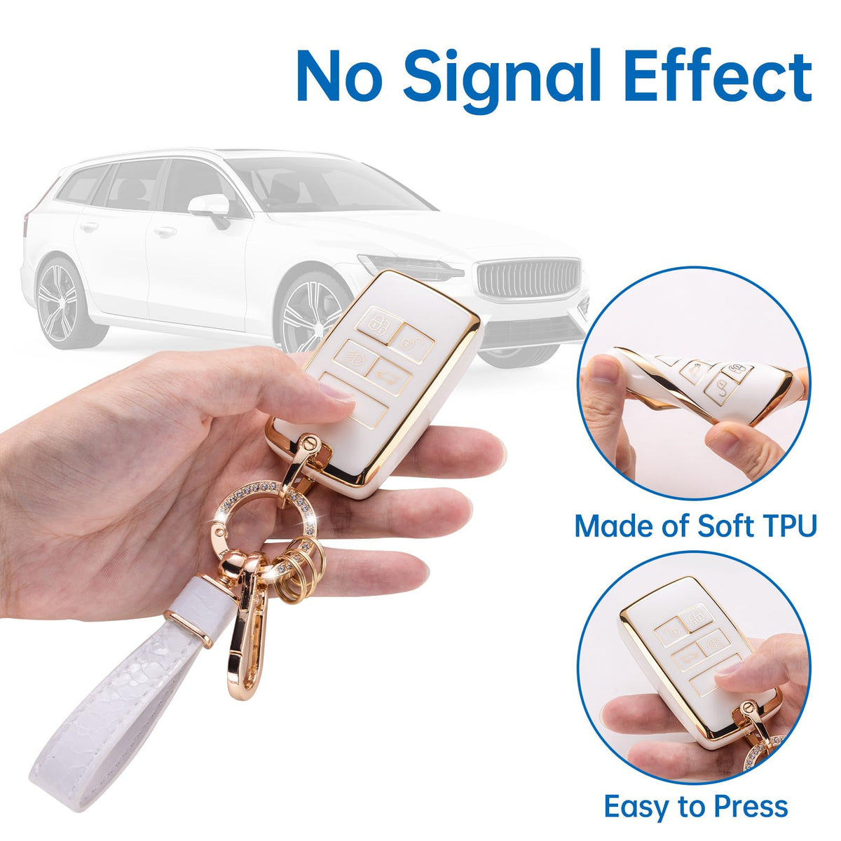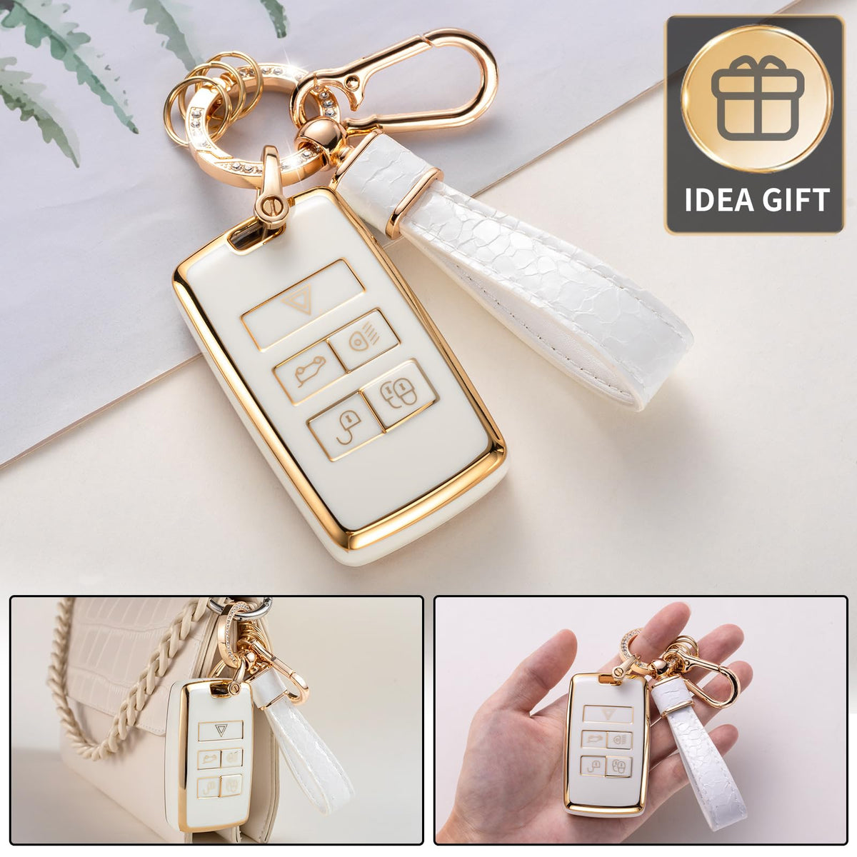 Key Fob Case for 2018-2023 Land Rover Range Rover Evoque Sport Vogue Discovery 5 Jaguar E I-PACE Smart Remote Key with Pearl Keychain Lanyard Color: White & Gold Material: Premium TPU Package Include: 1 * Soft TPU Key Protector for Land Rover (Note: NOT included the car key) 1 * Metal Circle Ring Clip with 3 Rings 1 * Metal D-buckle 1* Metal Carabiner Clip 1*Shiny Keychain Lanyard 1 * Screwdriver (Please keep them, you will need them to take out the keys)