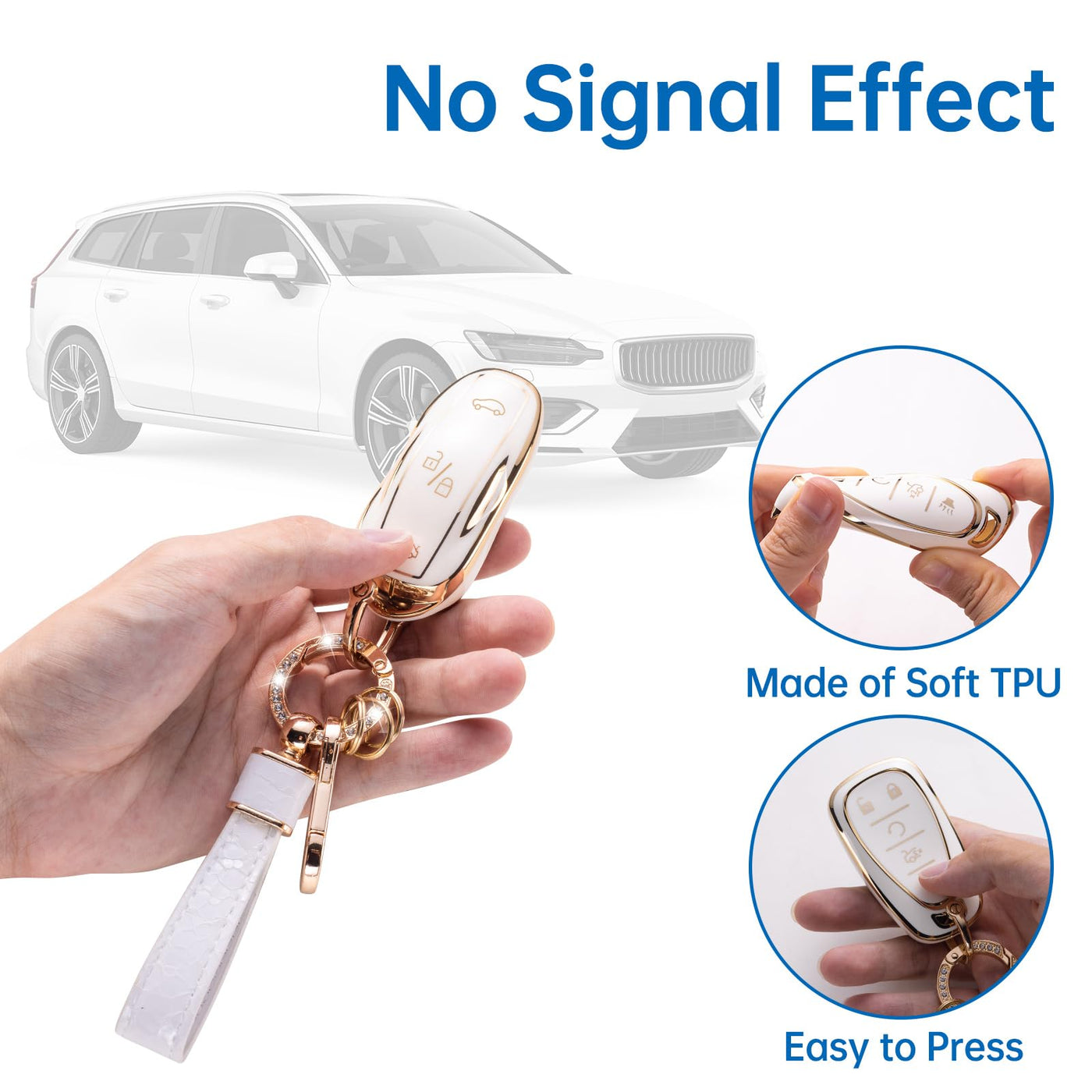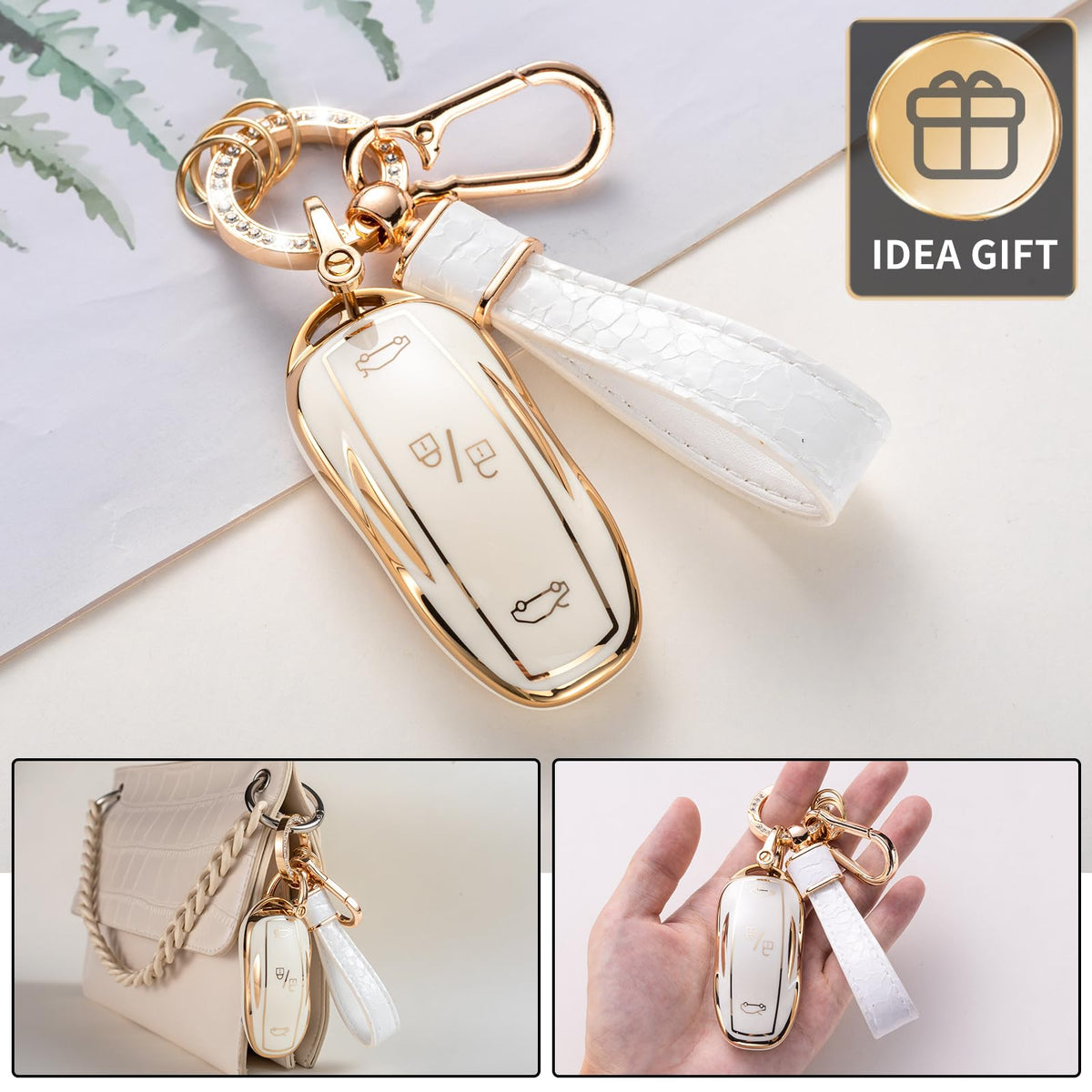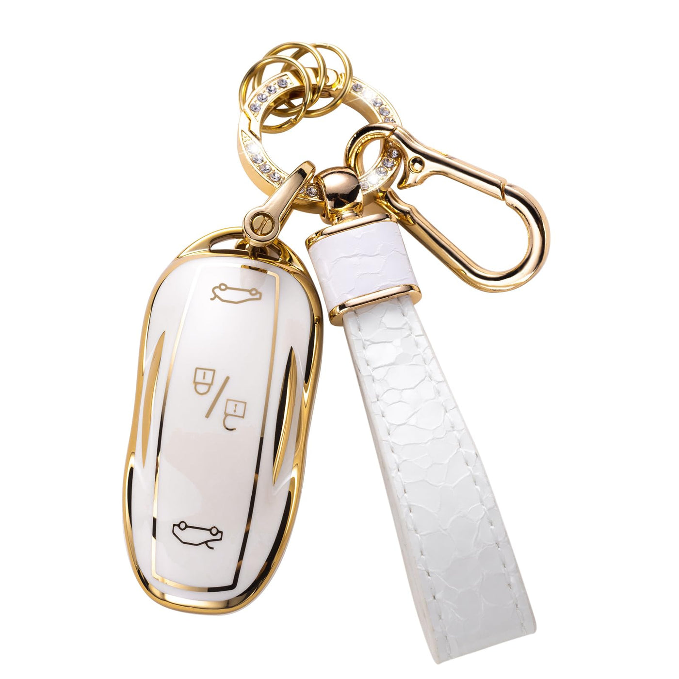 Key Fob Case for Tesla Model S Model 3 Model Y Smart Remote Key with Pearl Keychain Lanyard Color: White & Gold Material: Premium TPU Package Include: 1 * Soft TPU Key Protector for Tesla (Note: NOT included the car key) 1 * Metal Circle Ring Clip with 3 Rings 1 * Metal D-buckle 1* Metal Carabiner Clip 1*Shiny Keychain Lanyard 1 * Screwdriver (Please keep them, you will need them to take out the keys)