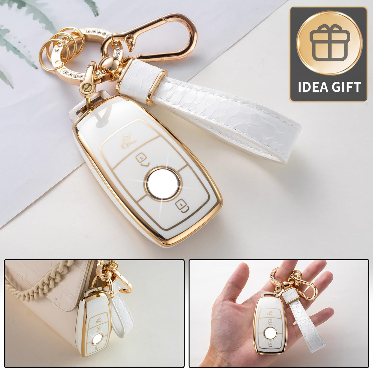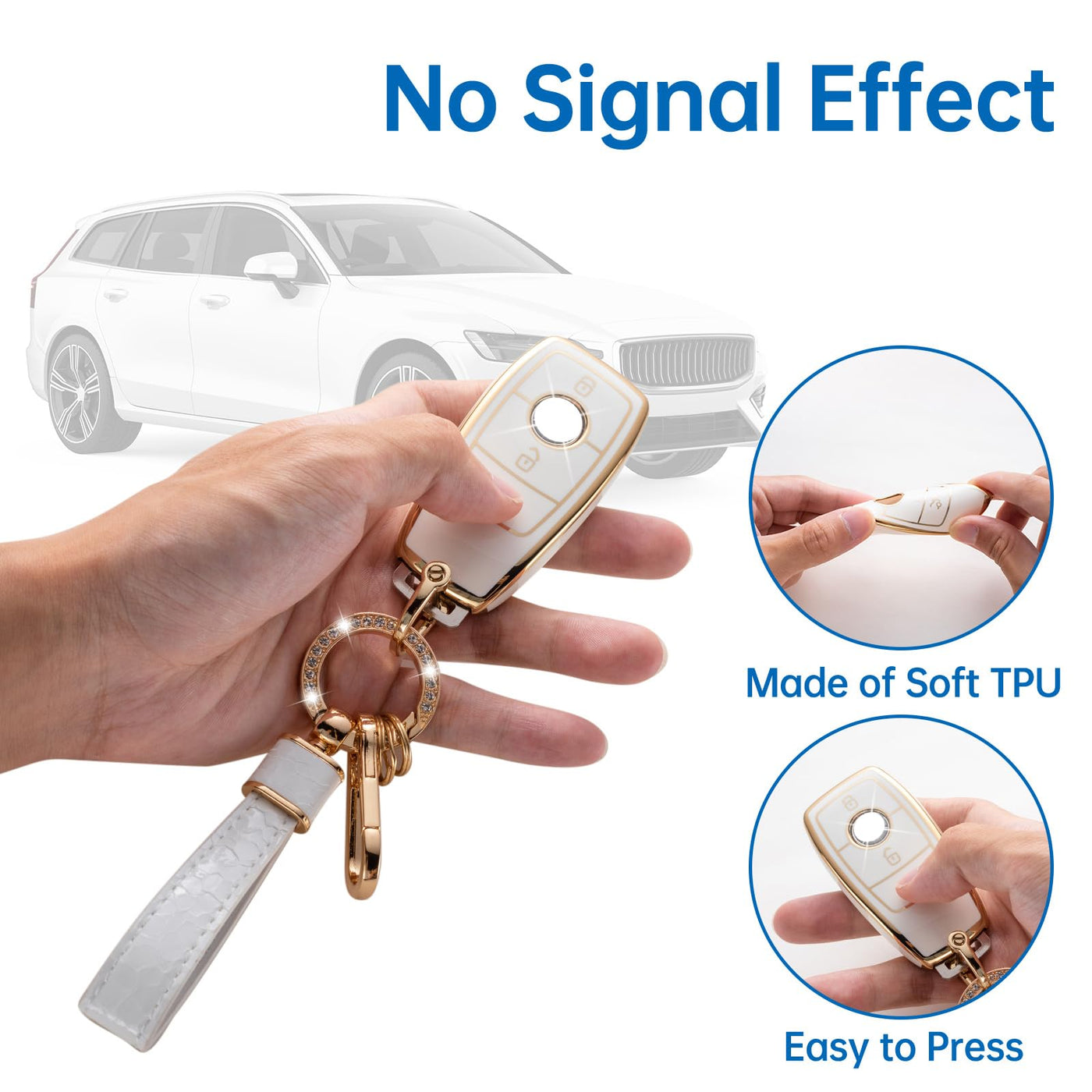 Key Fob Case for Mercedes Benz 2017-2021 E-Class 2018-2021 S-Class 2019-2021 A-Class C-Class G-Class Smart Remote Key with Pearl Keychain Lanyard Color: White & Gold Material: Premium TPU Package Include: 1 * Soft TPU Key Protector for Mercedes Benz(Note: NOT included the car key) 1 * Metal Circle Ring Clip with 3 Rings 1 * Metal D-buckle 1* Metal Carabiner Clip 1*Shiny Keychain Lanyard 1 * Screwdriver (Please keep them, you will need them to take out the keys)