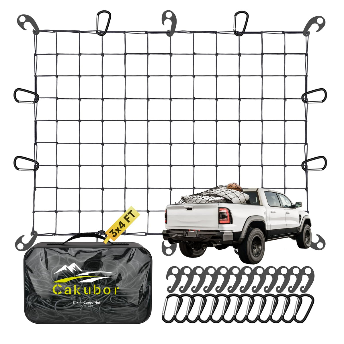 Q: Is the Cakubor Cargo Net suitable for heavy-duty use?A: Yes, this cargo net is made from super-duty materials, including a 4"x4" mesh design and comes with 24 universal hooks for secure attachment, making it ideal for heavy-duty use.