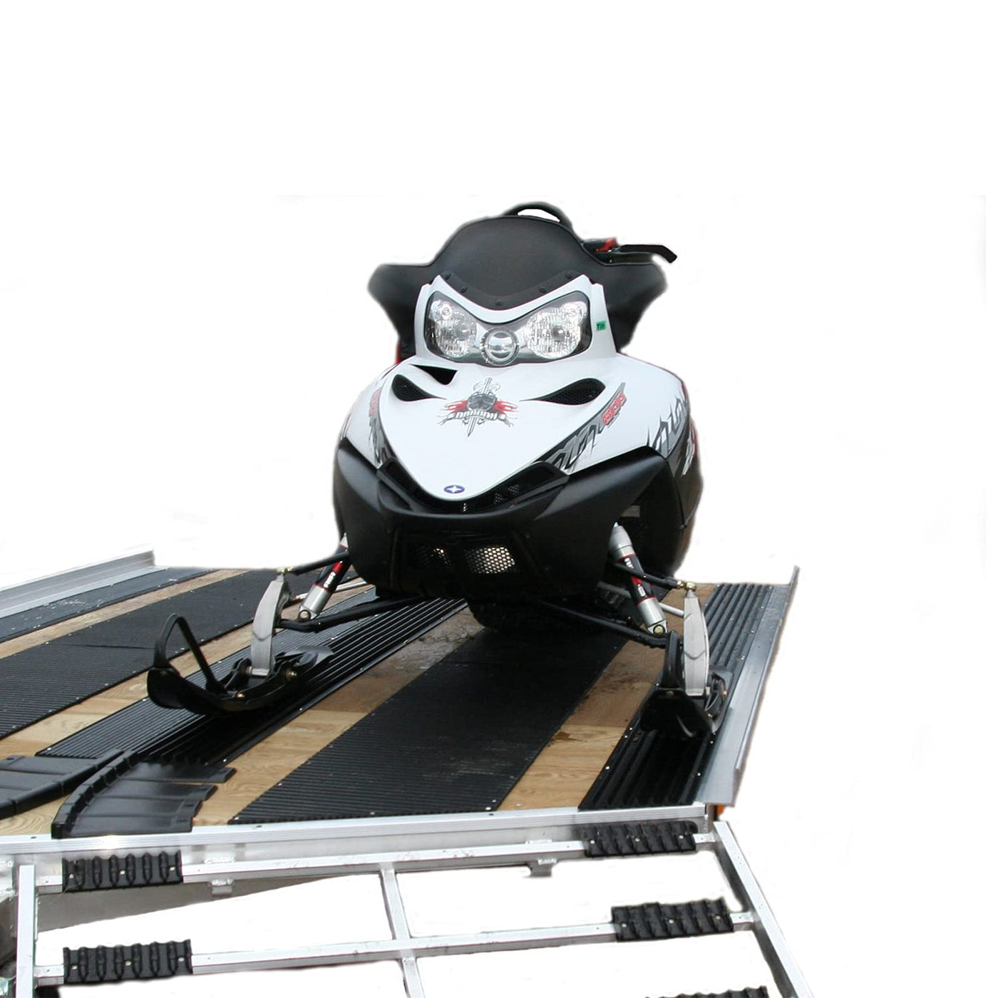 Q: How does the Caliber Multi-Glides Double Set help in loading snowmobiles?A: The Multi-Glides provide a friction-free surface, making it easier to load and unload snowmobiles onto the trailer, while accommodating different ski stances up to a 7-inch variance.