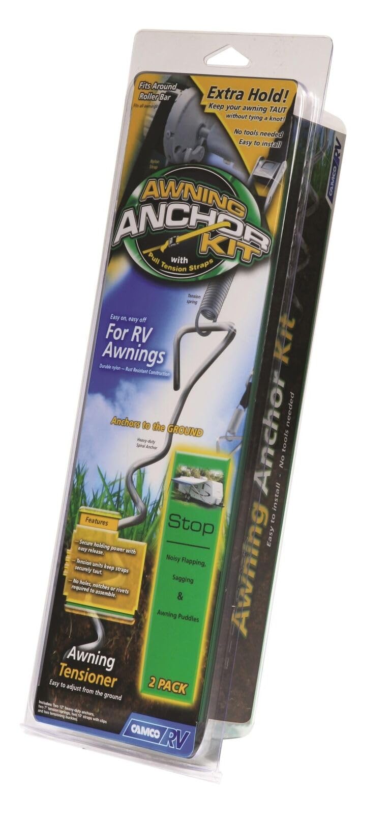 Camco Rv Awning Anchor Kit With Pull Tension Strap Is A Sturdy Strap And Springs Provide Even Distribution Of Tension And Make Securing Your Rv Awning Easy. Extra Holding Power Of Spiral Stakes Works Well In All Kinds Of Soil And Makes This Unit Ideal For Use In Sandy Soil. Perfect For Use At The Beach. Kit Stores Compactly And Fits All Awning Sizes.