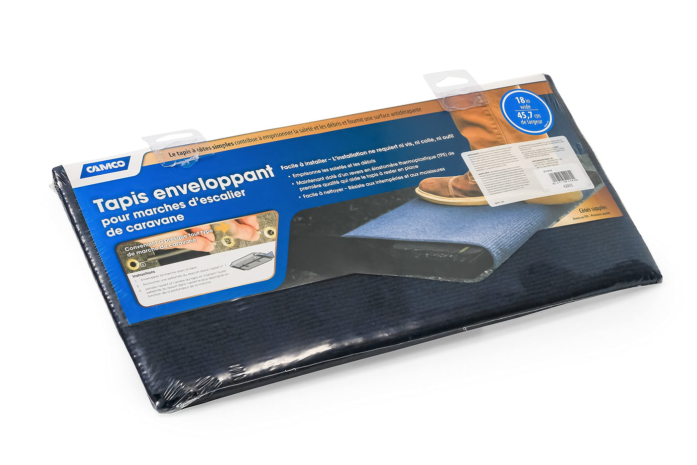 The Camco Premium Wrap Around Step Rug helps trap dirt. The improved TPE backing provides more grip between the rug and the step, keeping the rug in place and making sure it doesn't slip around the step. The Wrap Around Rug is easy to install with included springs-no screws, glue or tools required. It is weather tolerant, making it easy to clean. Rug measures 17.5'' x 18''.