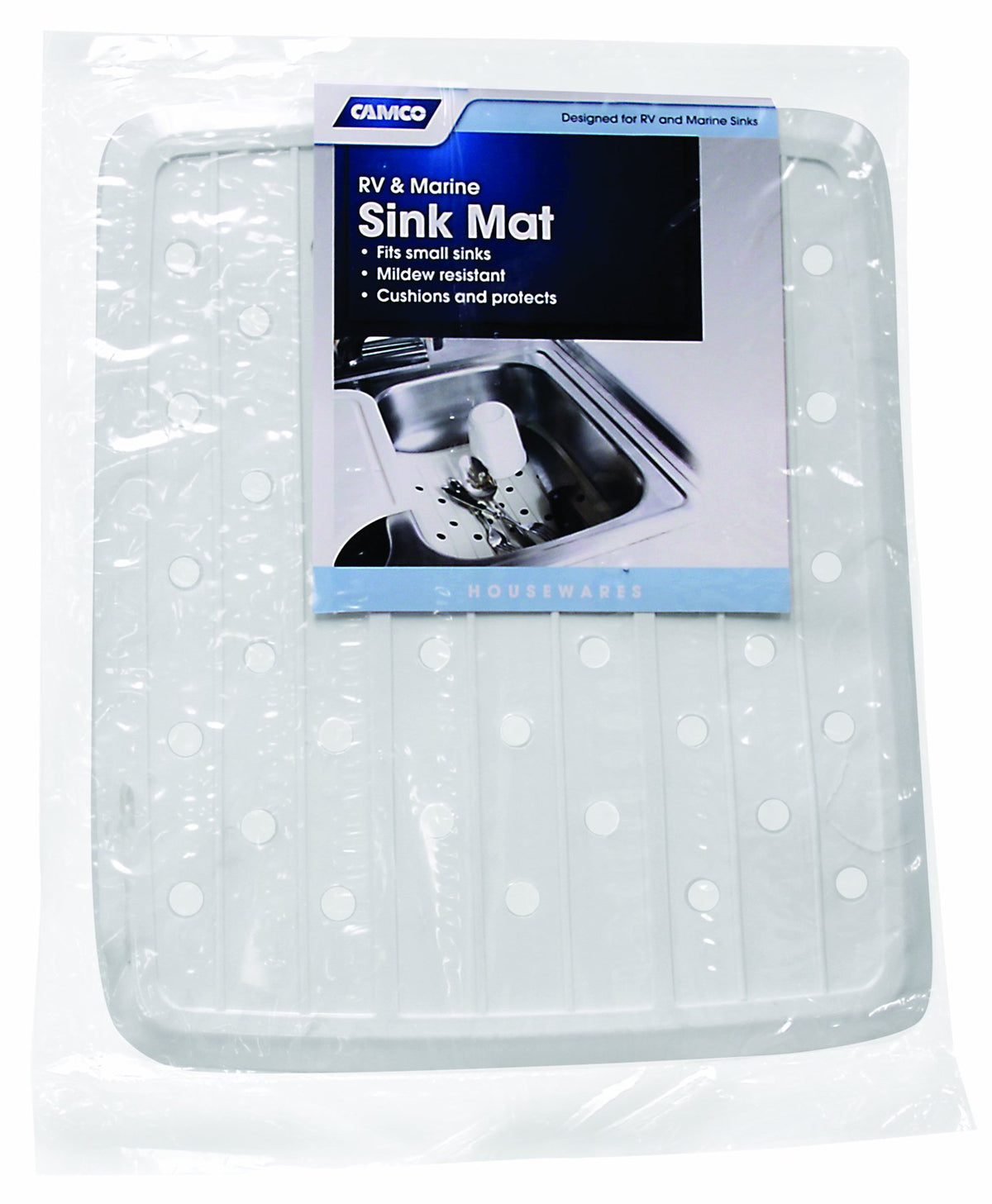 Cushion and protect glassware and dishes with Camco's RV & Marine Sink Mat. This Mat's small size is specifically engineered for RV & Marine sinks. Includes multiple drain holes to allow water to flow freely through mat. Made from mildew resistant vinyl.