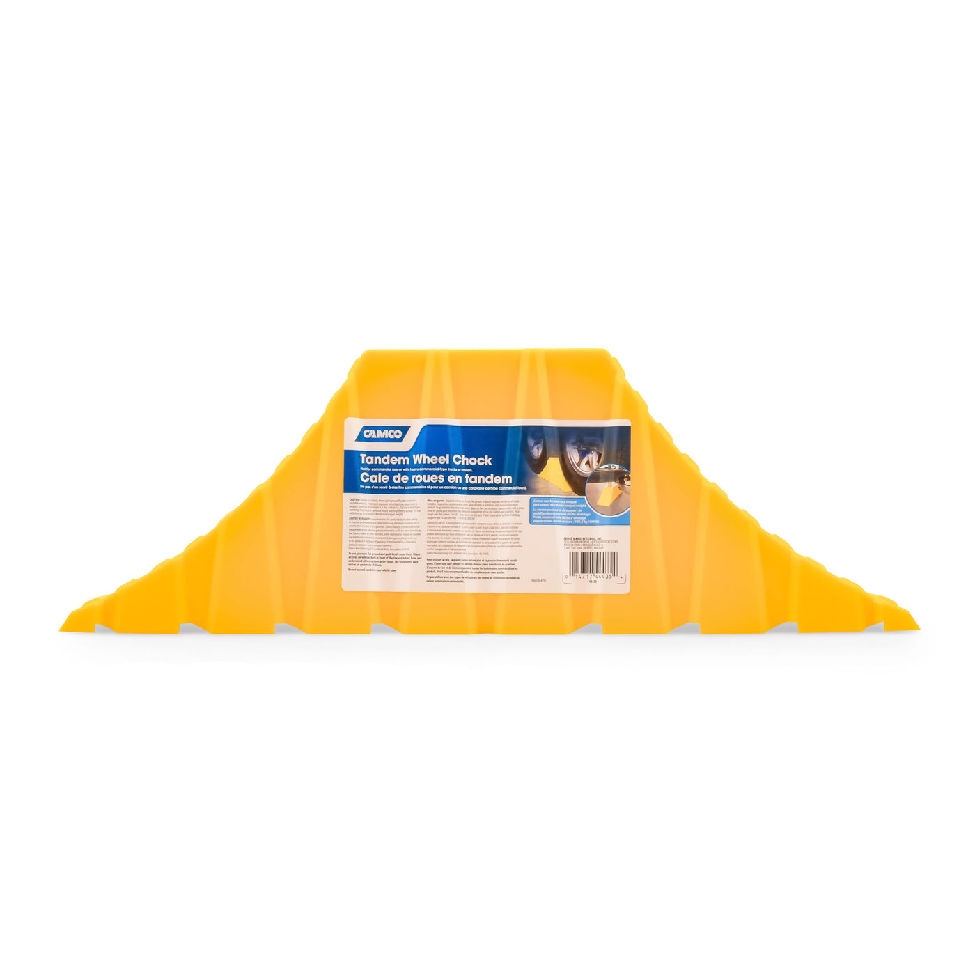 Q: Is the Camco 44435 Wheel Chock durable and weather-resistant?A: Yes, the wheel chock is made from durable polymer construction and features UV inhibitors, which enhance its longevity and resistance to weather conditions.