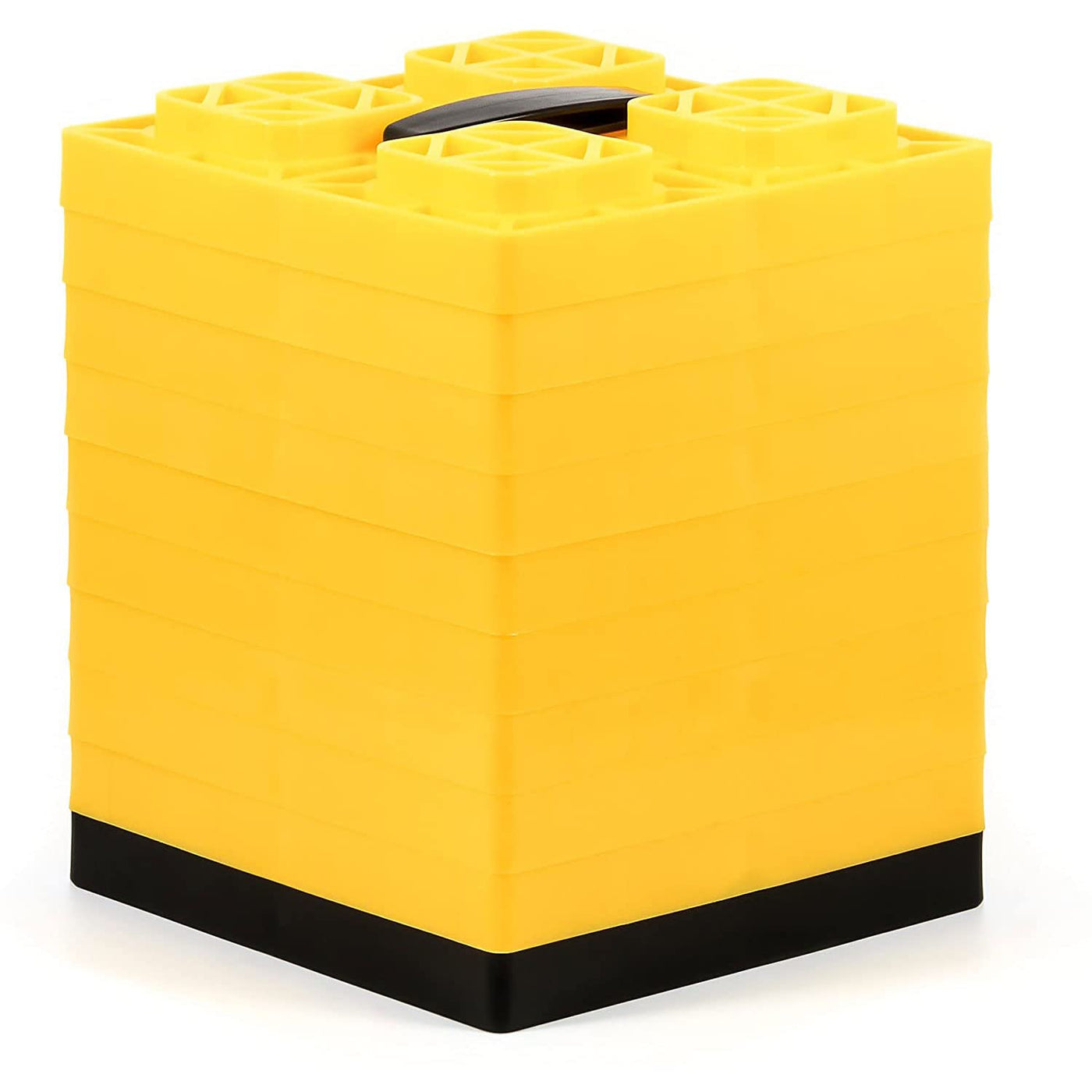 Upgrade your RV leveling experience with Camco's FasTen RV Leveling Blocks. This set of (10) yellow 2x2 blocks provides a customizable leveling solution for your RV. Compatible with various wheels and axles, these durable blocks ensure smooth and reliable leveling. For best results, do not use with a stack height over 4 1/2. When not in use, the innovative T-handle design makes it easy to carry and transport the leveling blocks. Trust in FasTen's USA-made, durable leveling blocks for fast and safe camper leveling. Whether you're a seasoned RVer or just starting out, these blocks are the ideal choice