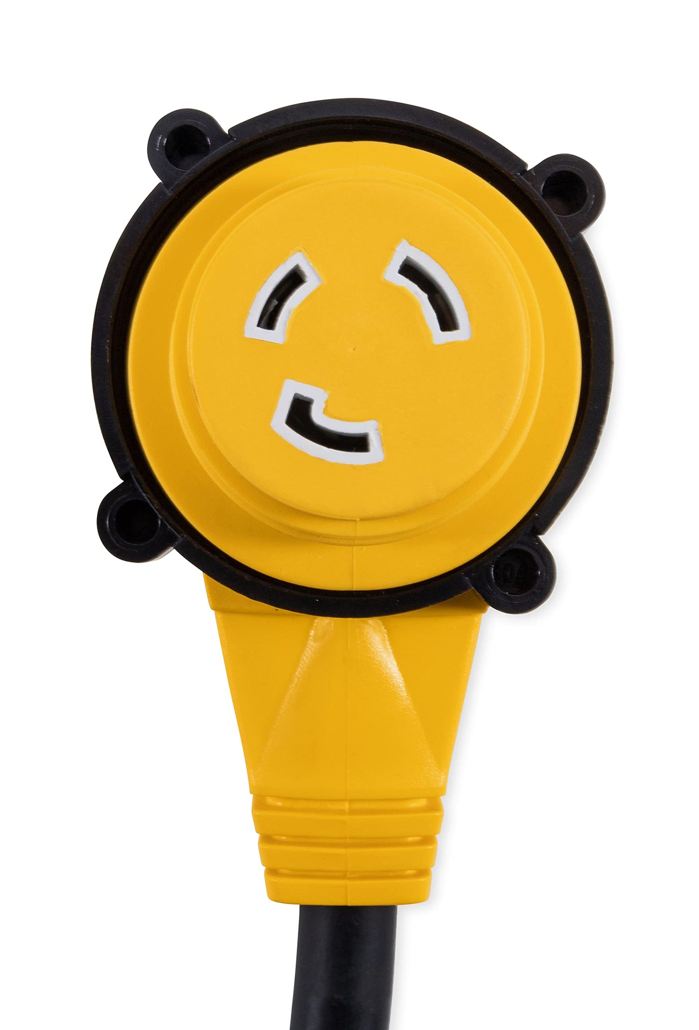 The Camco Heavy-Duty PowerGrip Adapter (30-Amp Standard Male/30-Amp 90-Degree Locking Female, 18-Inch) is designed to allow you to connect your marine-style 30-amp RV power inlet to a standard power source. Extremely flexible in design, the cord is coated with a heavy-duty flame retardant, heat-resistant PVC sheath that serves as protection from the outdoor elements, wear and tear. Hassle-free PowerGrip handles help assist in gripping, plugging and unplugging without straining or damaging the adapter. It features a 30-amp standard male (NEMA TT-30P) and a 90-degree 30-amp locking female (NEMA L5-30R) end. Rated for 125 volts/3750 watts and constructed with 100% copper, 10/3-gauge wires for superior conductivity. This product includes a limited 12-month warranty.
