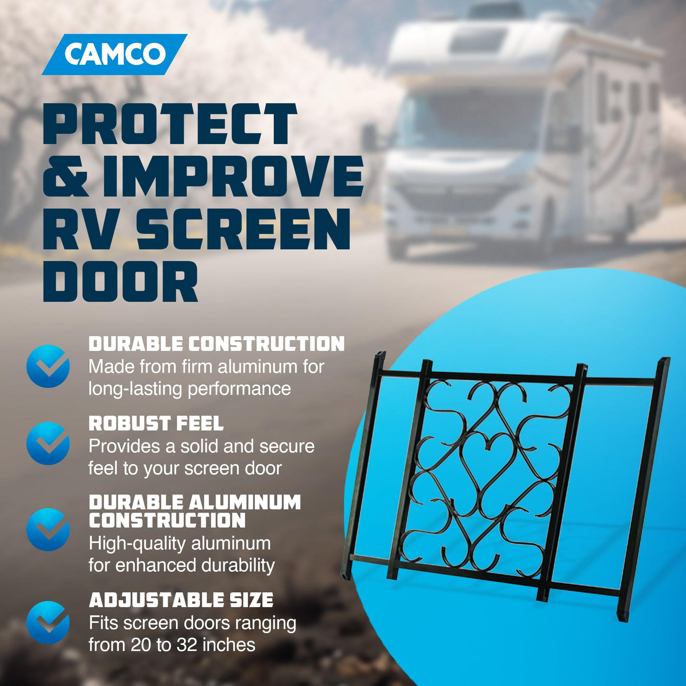 Camco Aluminum Deluxe Screen Door Grille Adjustable Up To 20 to 32 Inches Durable and Stylish Protection for Your Camper/RV, Bla