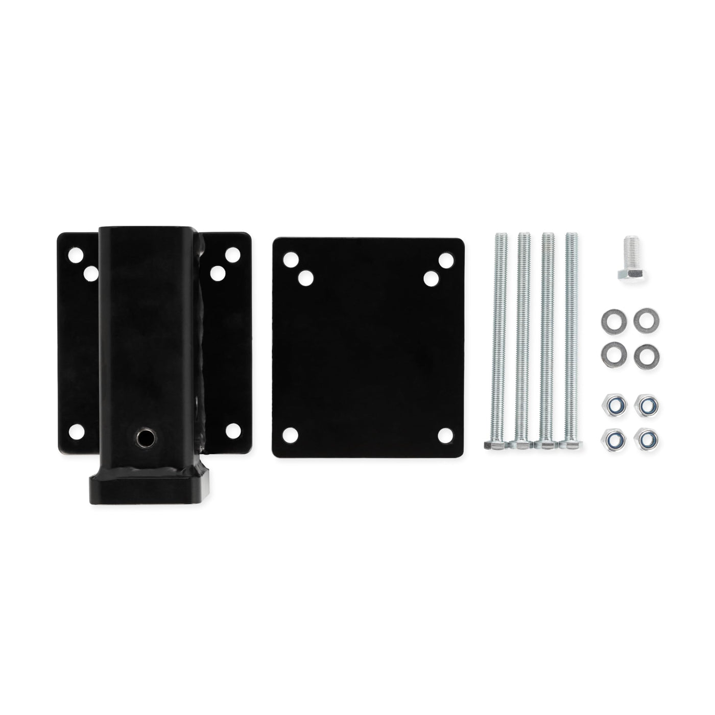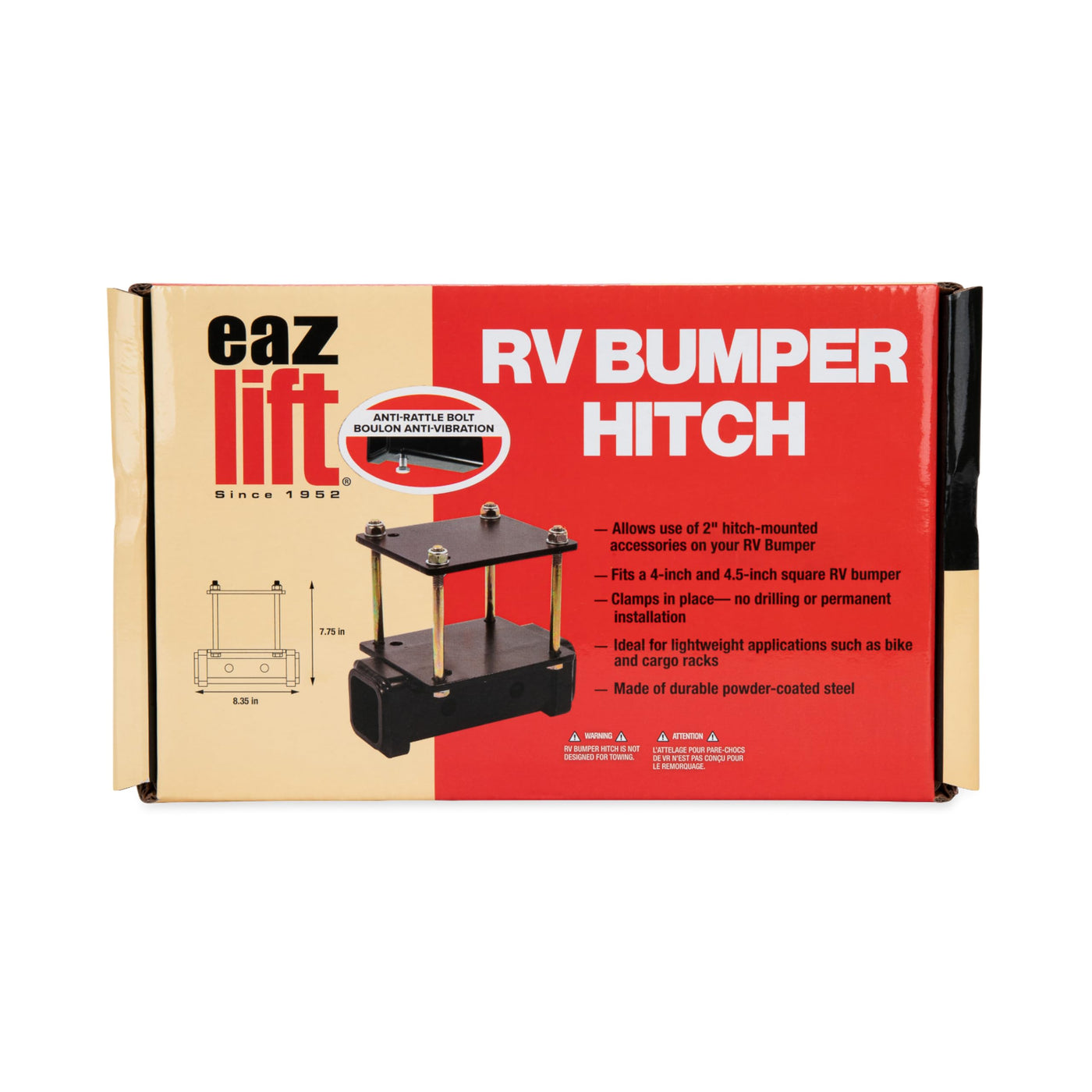 Enhance your outdoor adventures with Camco's Eaz-Lift Square RV Bumper Hitch. This versatile hitch turns your 4'' or 4 1/2'' square RV bumper into a convenient receiver hitch- no drilling or permanent installation required. Ideal for lightweight applications (such as bike and cargo racks), the 2 inch receiver hitch is ready to meet your carrying needs. Crafted with heavy-duty powder-coated steel, this RV hitch is built tough to withstand the elements and resist corrosion. Say goodbye to noisy installations with the included anti-rattle bolts. Measuring 7 3/4'' (T) x 8 3/8'' (W), this hitch is specifically designed for non-towing purposes. Elevate your travel experience today with the unbeatable convenience and reliability of Eaz-Lift's Square RV Bumper Hitch. Upgrade your adventures with this incredible RV accessory for outside!