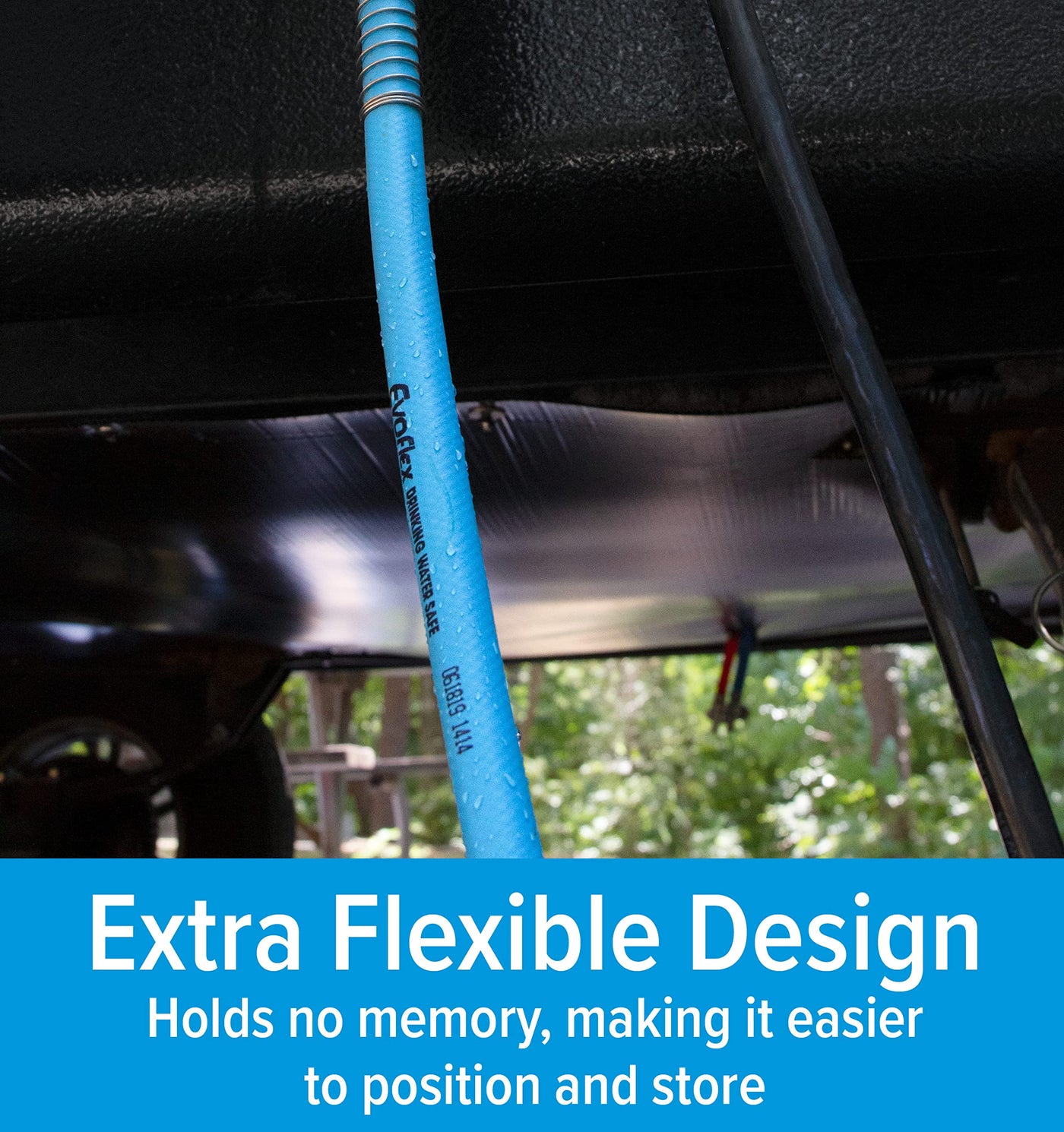 Q: How flexible is the Camco EvoFlex Drinking Water Hose?A: The EvoFlex hose is extremely flexible, allowing it to adapt to various storage needs and use cases, whether coiled for compact storage or extended for maximum reach.