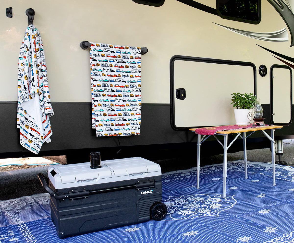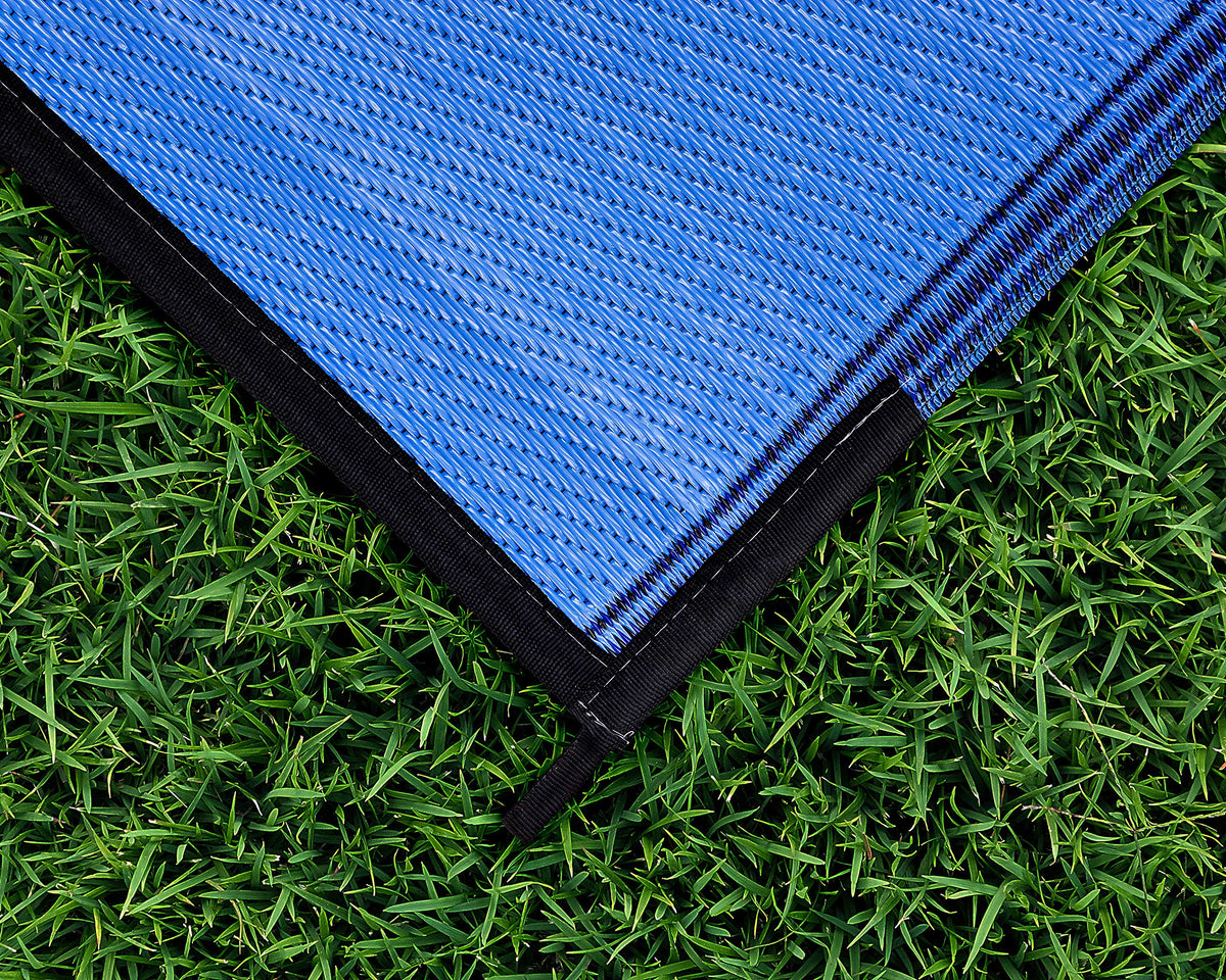 Q: What materials is the patio mat made of?A: The Camco patio mat is made from durable polypropylene, which is lightweight and resistant to wear, making it suitable for outdoor environments.
