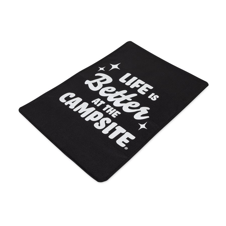 Camco'S Life Is Better At The Campsite Rv Door Window Light Blocking Shade Protects Your Rv Interior From The Sun And Helps Keep The Interior Temperature Cooler In Hot Weather. This Shade Also Provides Additional Privacy By Blocking Unwanted Outside Views. The Fun Design Features Large “Life Is Better At The Campsite” Text With Retro Stars. Product Measures 25 ¼-Inches (L) X 16 ¼-Inches (W) And Is Made Of Black Nylon Ripstop With A Silver Reflective Backing. Includes Hook And Loop Fasteners For Easy Installation.