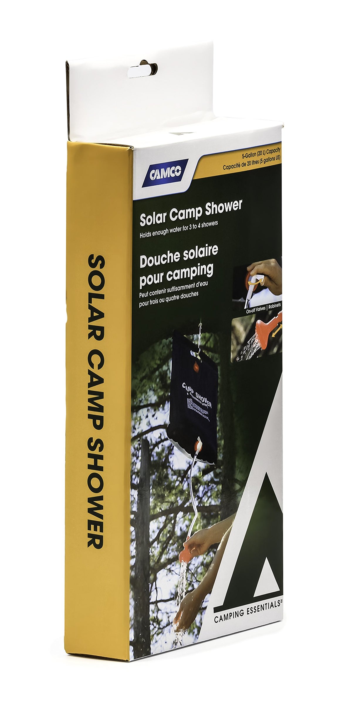 Camco Outdoor Natural Solar Shower With On-Off Valve For Campsites - Holds 5 Gallons Of Water, Sufficient For 3-4 Showers, Excel
