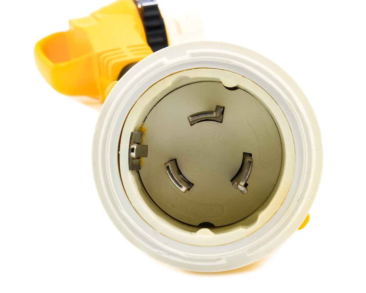 Q: What are the electrical specifications of the adapter?A: The Camco Power Grip adapter is rated for 125/250 volts and 12500 watts, featuring a heavy-duty 50-amp locking male (NEMA SS2-50P) and a 50-amp 90-degree locking female (NEMA SS2-50R) end for superior conductivity.