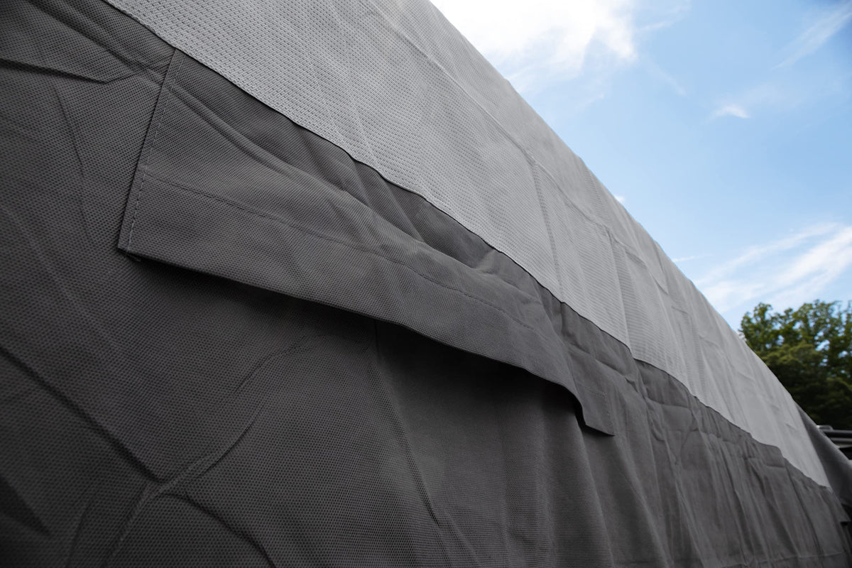 Q: What materials are used in the construction of the Camco ULTRAGuard RV cover?A: The cover features a three-layer top made of spunbond polypropylene and a microporous breathable film, while the sides consist of two extra-durable layers of spunbond polypropylene.