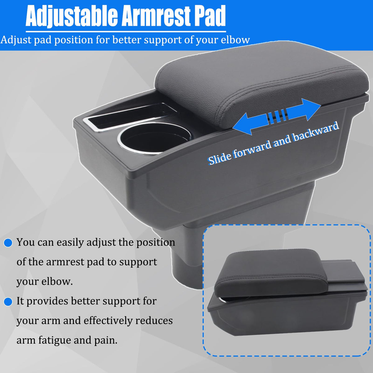 Q: How much storage space does this car armrest box offer?A: This armrest box features a dual-layered storage design, providing ample space to store your essentials such as phones, drinks, and other small items, helping to keep your vehicle organized.