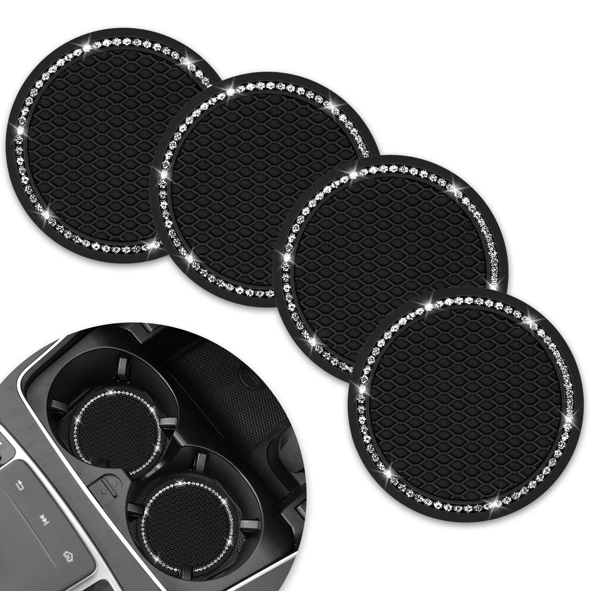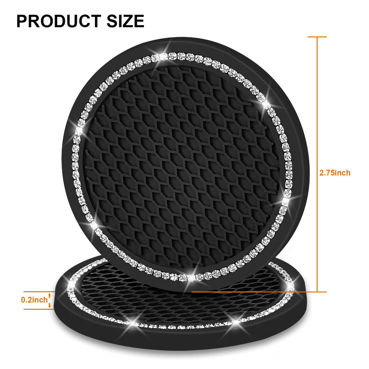 Product Details Material: Environmentally-friendly silicone & bling crystal rhinestone Diameter: 2.75inchesThickness: 0.2inchesProduct FeaturesHigh quality material: The Car coasters is made of rubber soft and bendable and not easily deformed.Super cute car coaster: 2.75 inches diameters soft car cup holder coaster fit 99% car in the market. It's classy looking help to keep your drinks sturdy.Easy to install & easy to clean: It's easy to install and clean by being silicone.They fit perfectly in the cup holder circle you don't need any type of adhesive or anything you just drop them in and they stay put there are absolutely adorable they match with all my other rhinestone accessories in the car. You can remove them at anytime, if you dont want to use it.Best gift: This is not only a nice little touch up to our vehicle,but also the best gift for family and friends. It can add a warm atmosphere to their car and warm up your feelings.Universal Compatibly: Widely used for Ford, Buick, Mazda CX-7, CX-5,Nissan Honda Civic sedan, Toyota and most cars.