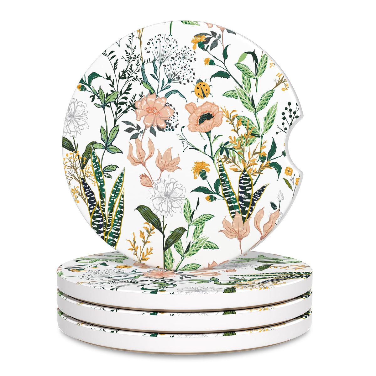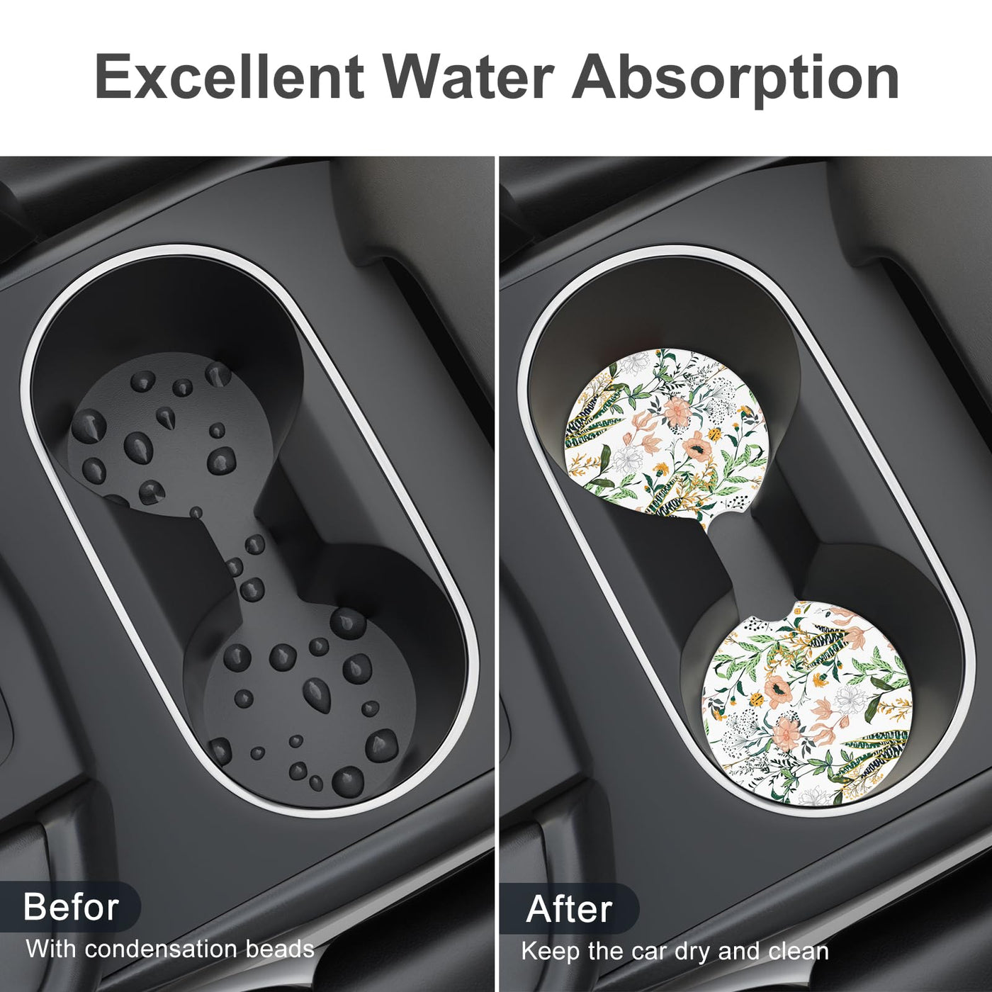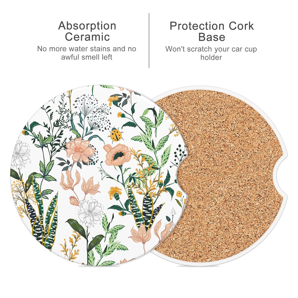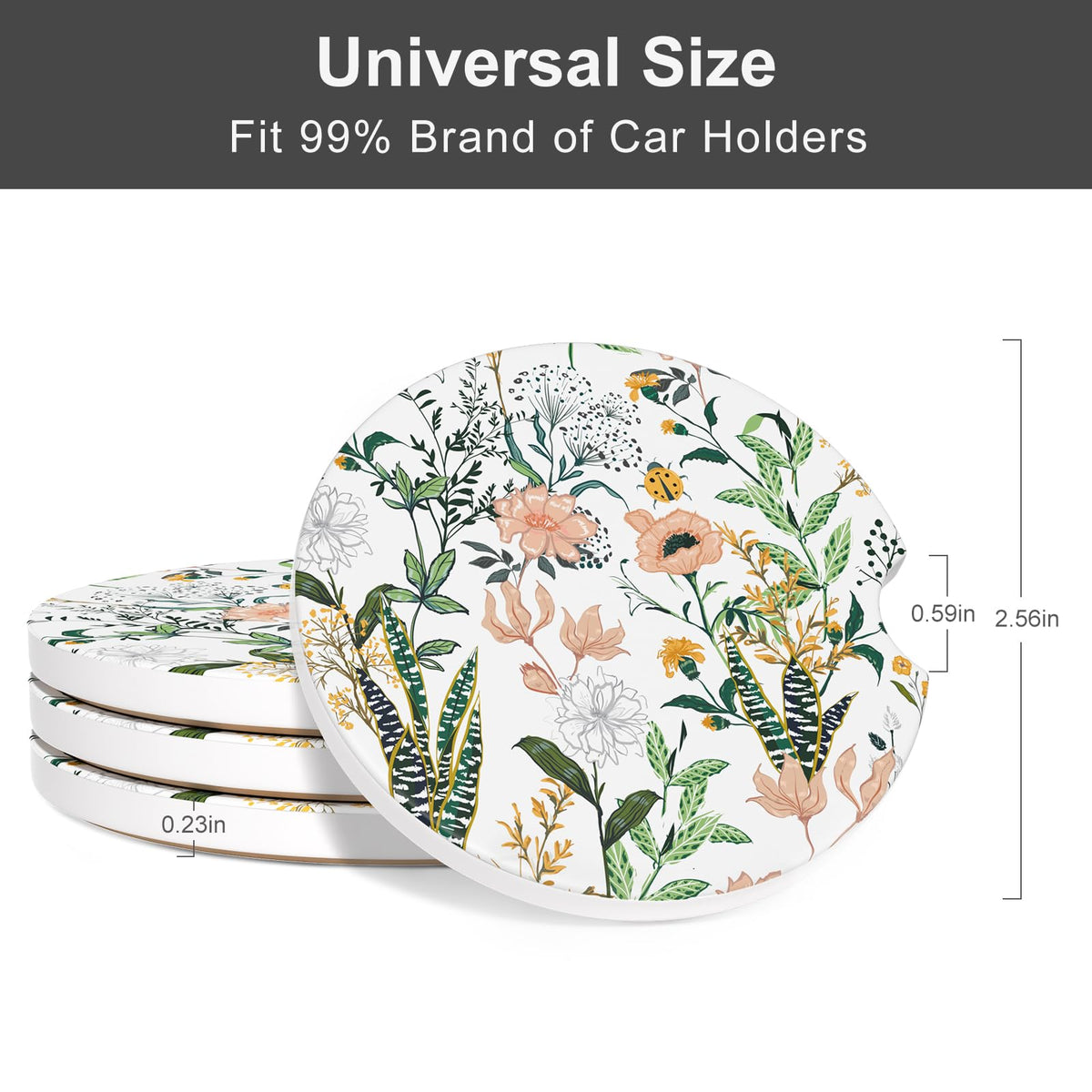 Details: Material: Ceramic Diameter: 2.56 inch Package Includes: 1 x 4 Pack Insert Car Coasters Why Choose Our Car Coasters: A balance of utility and aesthetics Perfect decoration for your cute car Protects your car cup holders from being dirty and smelly Makes you more attractive and shows your fashion Unique Design: The Car Coasters for Cup Holders uses a combination of absorbent ceramic and non slip cork base. Simple and fashionable. The unique design makes people shine. It is the best gift choice for family, colleagues, friends and car enthusiasts. Standard Size: Round shaped with diameter 2.56 inch, thickness 0.23 inch, universal auto anti slip insert coaster fit 99% brands of cars. Non Slip Cork Base: Used cork for base to enhance the friction and protect cup holder from scratches. Car cup holder coaster can firmly grip the cup holder and will not make a collision sound due to the driving process of the car. Water Absorption: Our absorbent ceramic car cup holder Coaster for drinks adopts a unique process and has excellent water absorption. It can quickly absorb spilled water, coffee, and cola within 10 - 15 seconds, will keep vehicle free from cold drink sweat and keeping your car dry and clean. Easy to Clean: Specialized finger groove designed to take out or put in with ease. Easy to clean, it can be clean by dry/wet paper or towel.