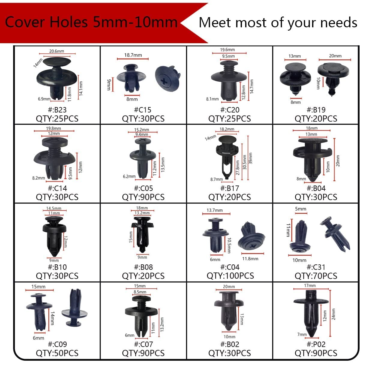 Q: What sizes of push pins are included in the Car Push Retainer Clips kit?A: The Car Push Retainer Clips kit includes 16 of the most popular sizes, covering hole sizes from 5mm to 10mm, including 6mm, 6.2mm, 6.25mm, 7mm, 7.8mm, 8mm, and 9mm.