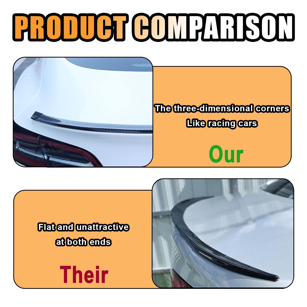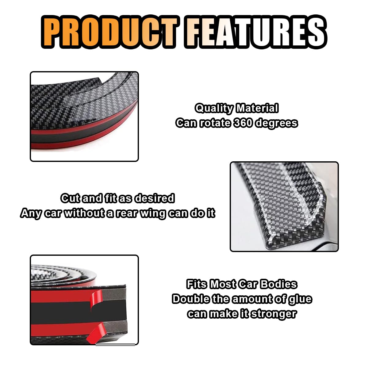 Rubber Spoiler Decal Strips can be easily attached to the back of your car, giving it a sleek and modern look.Specification:Brand: JOYCOURTName: Car Rear Spoiler Roof Lip KitColor: Black/Carbon fiber black/Matte blackMaterial: RubberSize: 57.75*1.45inApplicable: Most vehiclesFeatures:-Classic black and stylish. Add an element of personalization by choosing a car exterior that matches your personality.-The car rear roof spoiler is easy to install and clean, there are self-adhesive tapes to install, easy to install, no special skills or tools are required.-The tail spoiler helps protect against damage from scratches and collisions, prolonging your car's life.