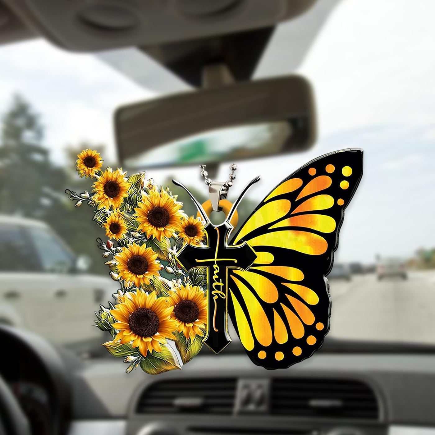 Car Rear View Mirror Accessories Sunflower Butterfly Jesus Cross Christian Hanging Ornament 2D Flat Religious Christian Home Car