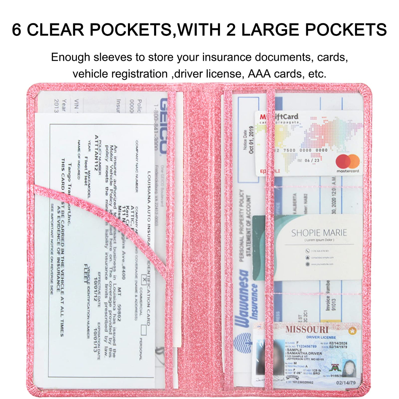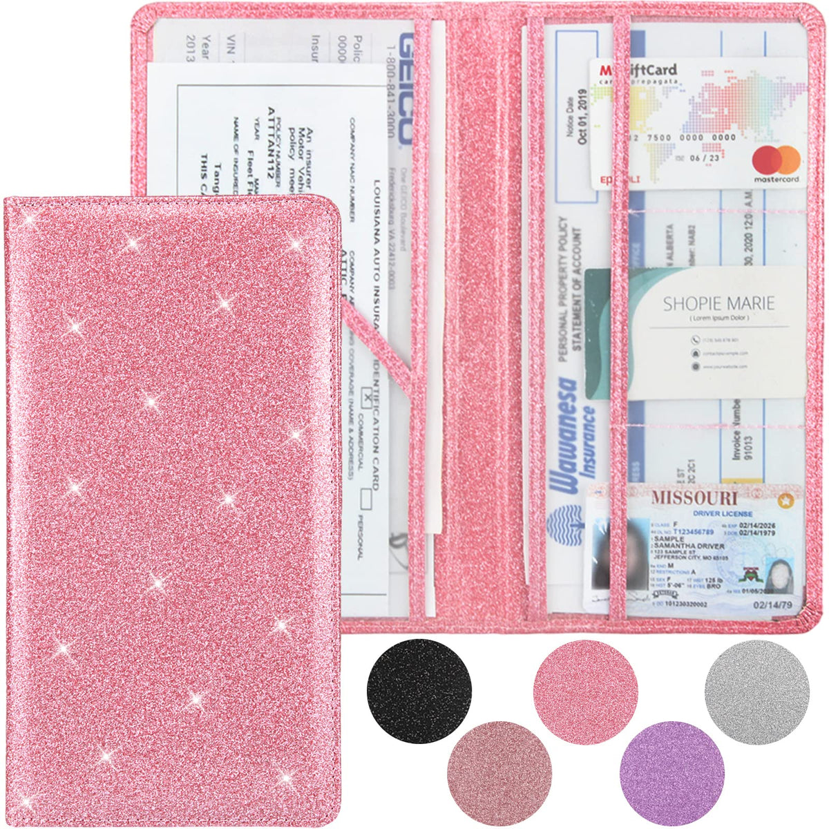 Car Registration And Insurance Holder, Premium Bling Leather Insurance And Registration Holder,Vehicle Glove Box Car Organizer,Wallet Accessories Case With Magnetic Shut For Cards, Essential Document, Driver License (Pink)