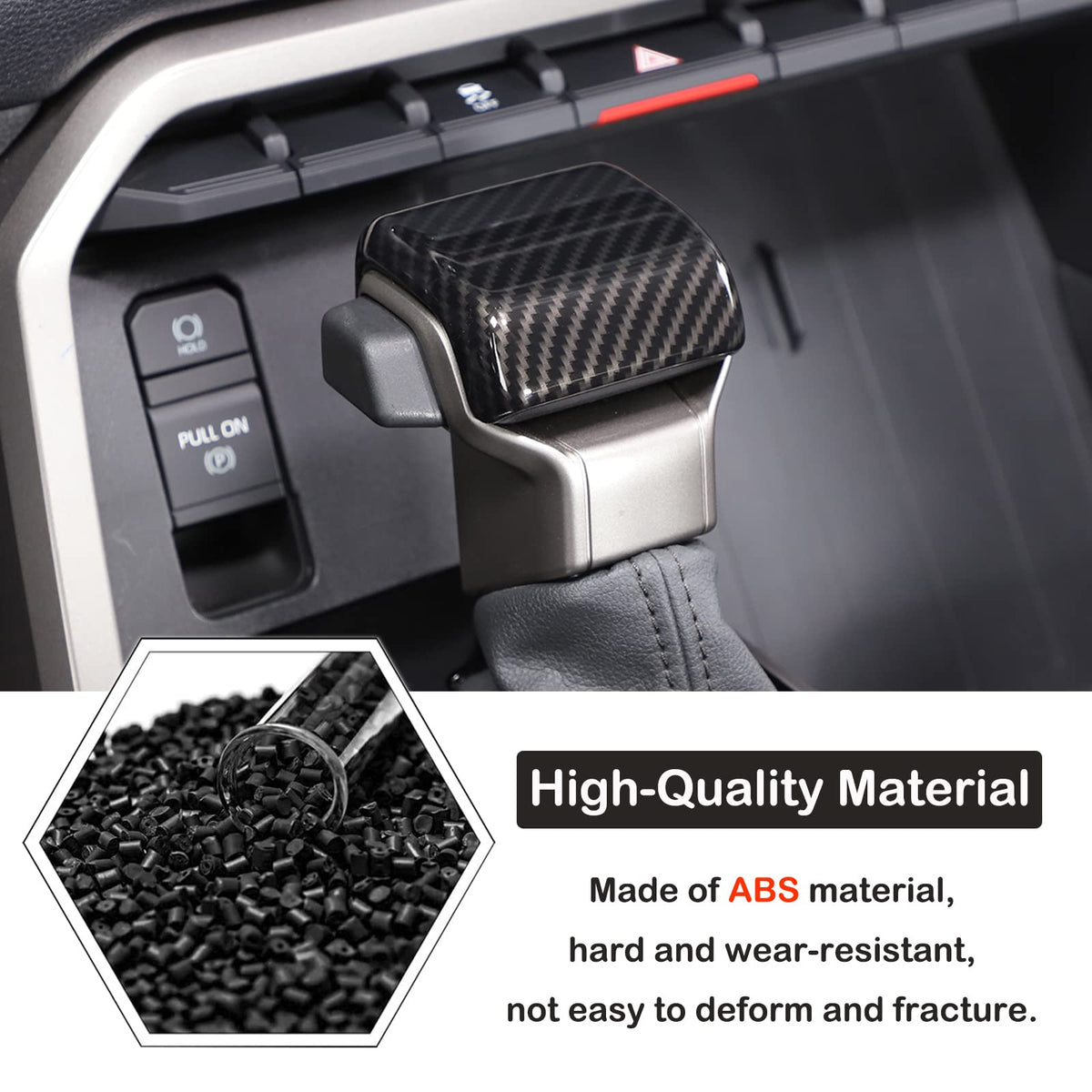 Q: What material is the Car Shifter Gear Hand Brake Trim Cover made from?A: The trim cover is made from high-quality Acrylonitrile Butadiene Styrene (ABS) material, featuring a carbon fiber pattern coating that provides a smooth texture and scratch resistance, ensuring long-term durability.