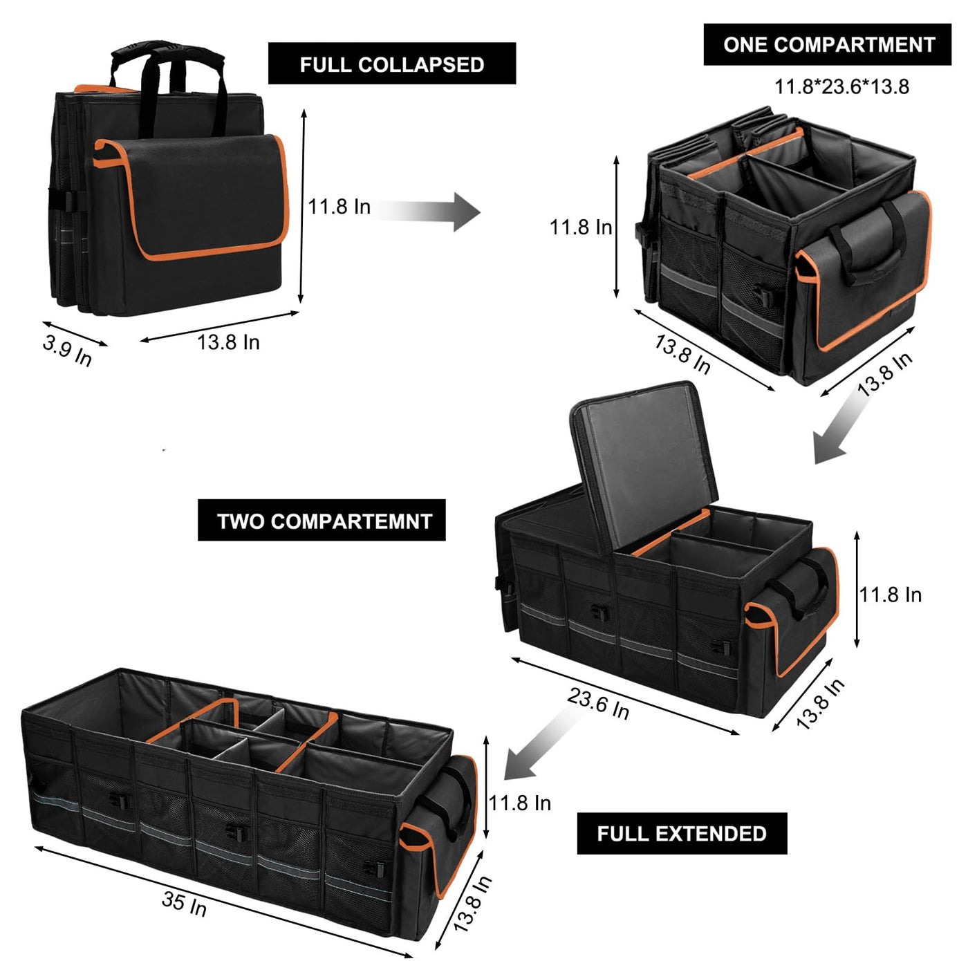 Trunk Organizer are made of 600D waterproof Oxford polyester, which is rugged and easy to clean. The inner layer is made of 2.5 mm PE plate, durable and not easily deformed. It also includes two removable, easy-to-clean baseboards for increased rigidity and easy subsequent cleaning