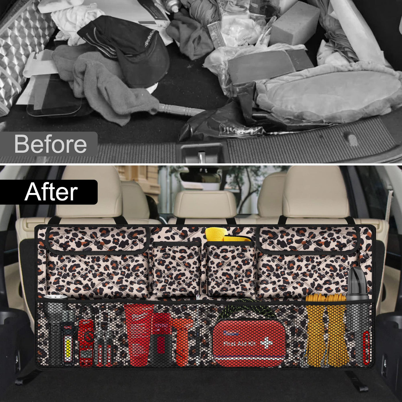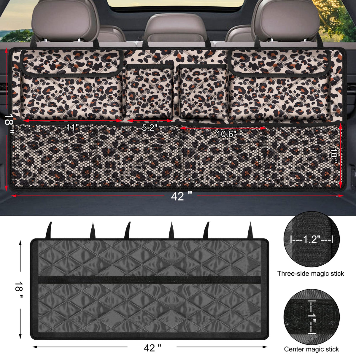 ?Install Easily & Fit 90% Cars?The car trunk organizer holds with 3 strong straps and clip on and off buckles to install easily in seconds. Also fits 90% car types, this hanging trunk organizer for suv,jeep, trunk, minivan,ect.And it is perfect choice as car accessories for women and men. | ?Waterproof & Strengthen Load-bearing?: The collapsible car organizer trunk is made of composite waterproof material, which is waterproof and splash-proof in the daily application process, and is also easy to clean. Stricter sewing process requirements and durable materials make the product more load-bearing and easy to handle heavy groceries. | ?Upgrade Size?: Improved design for car organizer size to meet more car models and storage needs. The size of the car organization has been changed from about 30 inches to 44 inches, providing more storage space, four cloth pockets and four mesh pockets.Ideal for keeping your car neat and organized. | ?Stability Design?: The trunk organizer for car with a firm and stable buckle design, you can adjust the length of the buckle strap according to your needs, so that the product fits more stably and firmly. At the same time, in order to increase the stability of the product, we also added four hook and loop tapes on the back of the product to increase the stability of the product during driving. | ?NOTE? Our suv trunk organizer of reinforcement strip are magic stick, suitable for seat back for felt material, not for leather, glossy, or suede.
