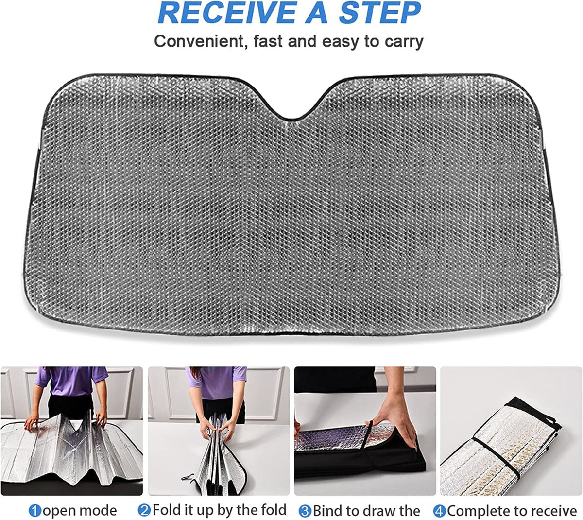 senya Car Windshield Sun Shade, Accordion Folding Auto Sunshade for Car Truck SUV, Blocks Sun Visor Protector, Keep Your Vehicle Cool, Easy To Use, 55'' x 27.6''Size: 55'' x 27.6'' (140 x 70 cm)Features: 1.Protect your car dashboard from cracking and fading by blocking the Sunlight.2.Keeping your vehicle steering and interior at the ideal temperature.3.Reduce the fuel consumption saving air conditioning. 4.Perfectly fits most car windshields 5.Compact, portable and can be taken anywhere! Tips: Our Windshield Sunshade With a dovetail suction cup, the sun visor can be adsorbed on the windshield to increase the stability. When the suction cup is used, it can be soaked in water to increase the adsorption, and the small hole on the suction cup can be quickly removed by gently pulling it.