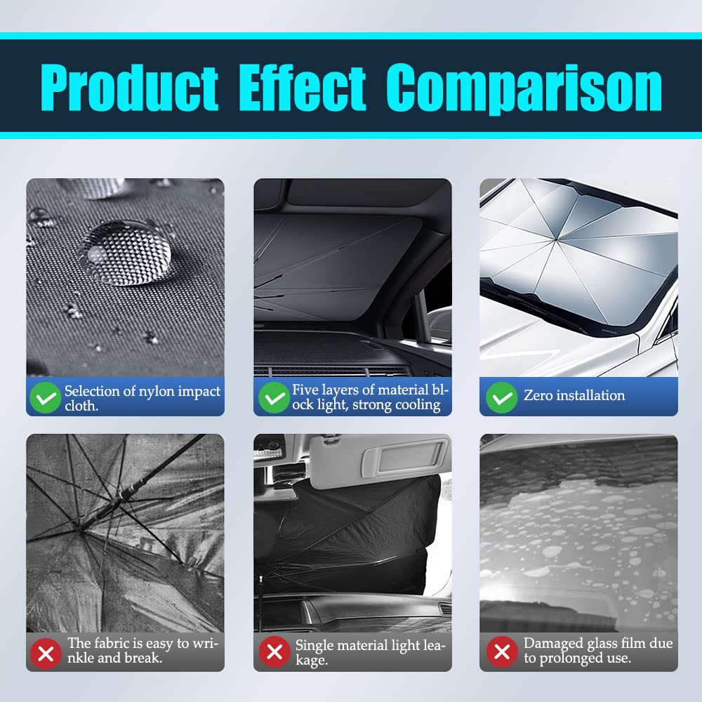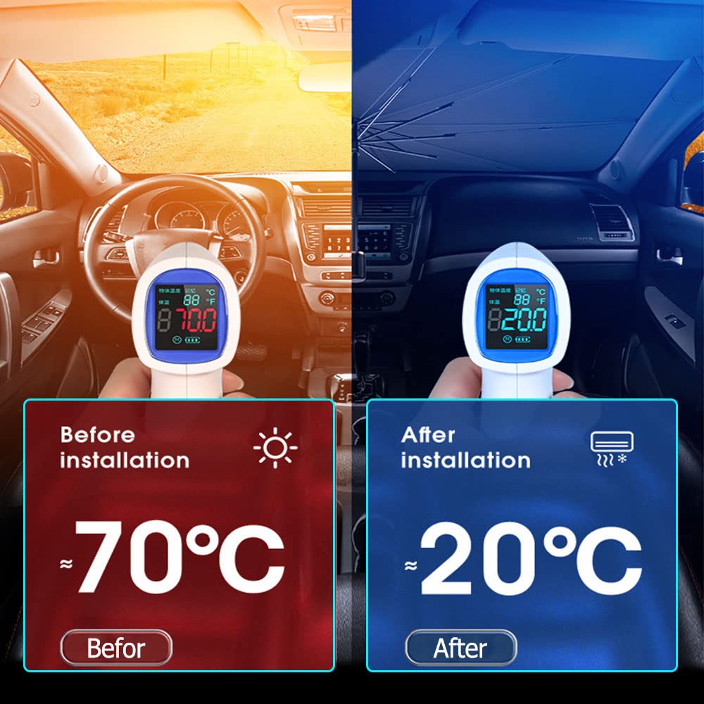 Sunshade for Car Windshield: Car Windshield Sunshade Umbrella not easy to be damaged under high temperature for a long time to keep the air in the car fresh. Easy to use and store: Just open and unfold it to make it close to the front windshield window, and then put down the sun visor to fix it in place. When not in use, you can fold it back into the storage bag in a few seconds and place it in the glove box and side door pocket. About us: We are committed to researching on-board products to improve driving safety and comfort, provide maximum sun protection for your vehicle, effectively keep the car cool and bring you a pleasant driving experience.