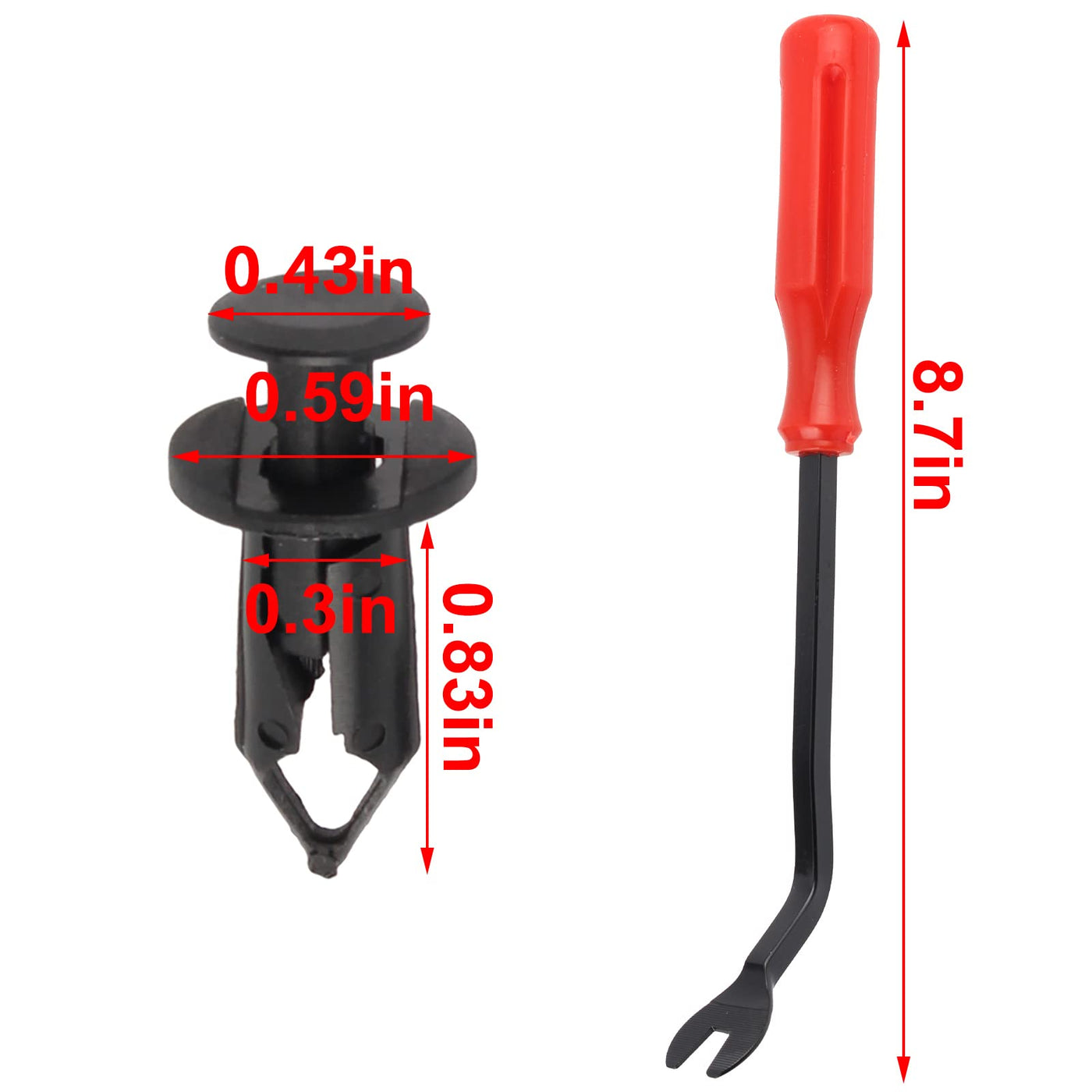 Q: What is included in the CARBBIA clips package?A: The CARBBIA clips package includes a total of 120 clips along with one removal tool. This comprehensive set allows you to easily replace old clips and maintain your vehicle's body panels.
