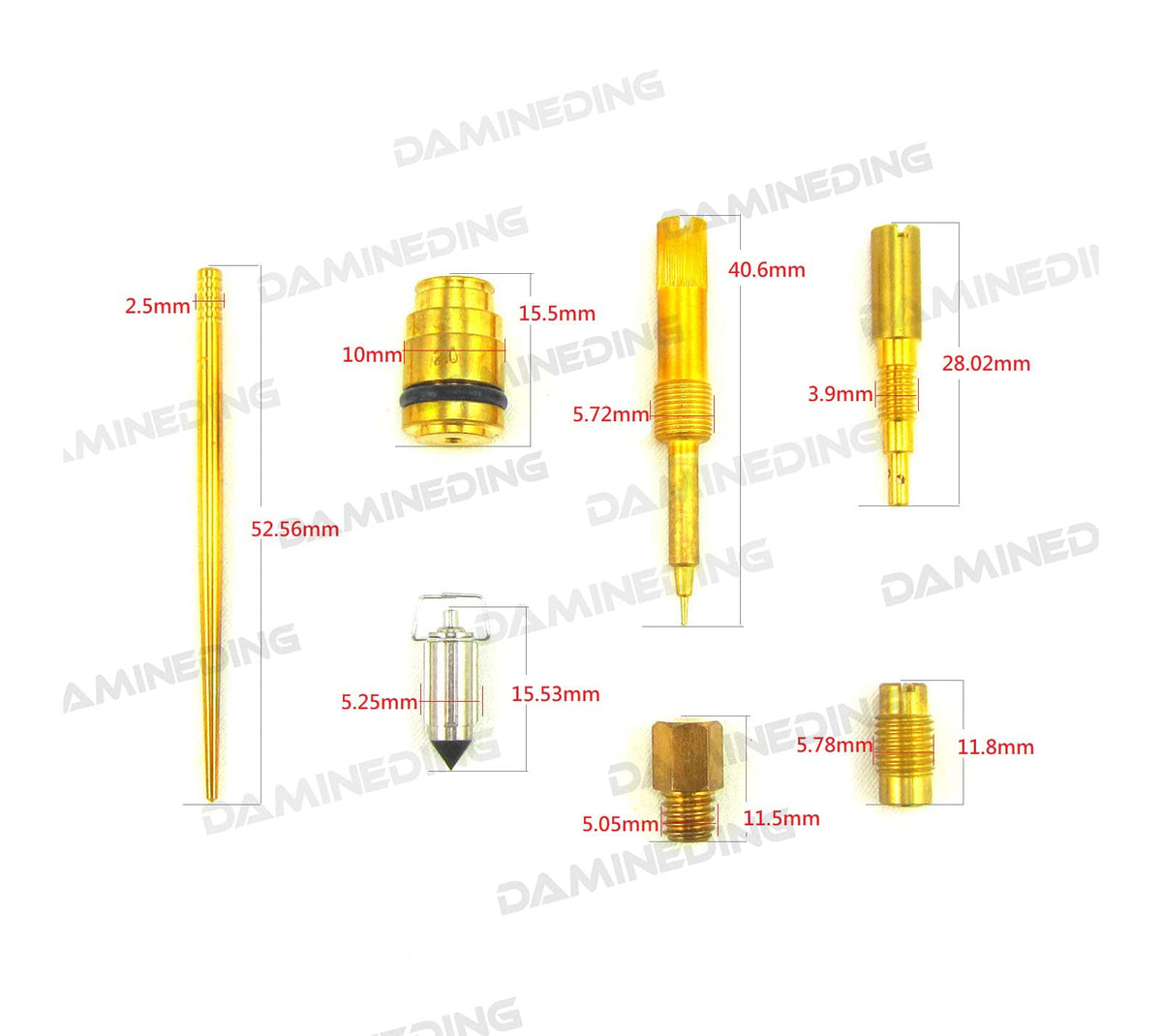 Q: What items are included in the carburetor repair kit?A: Each kit includes essential components such as Main Jet #165, Slow Jet #17.5, Needle #Y217, and Seat #2.0, ensuring you have all the necessary parts for a complete rebuild.