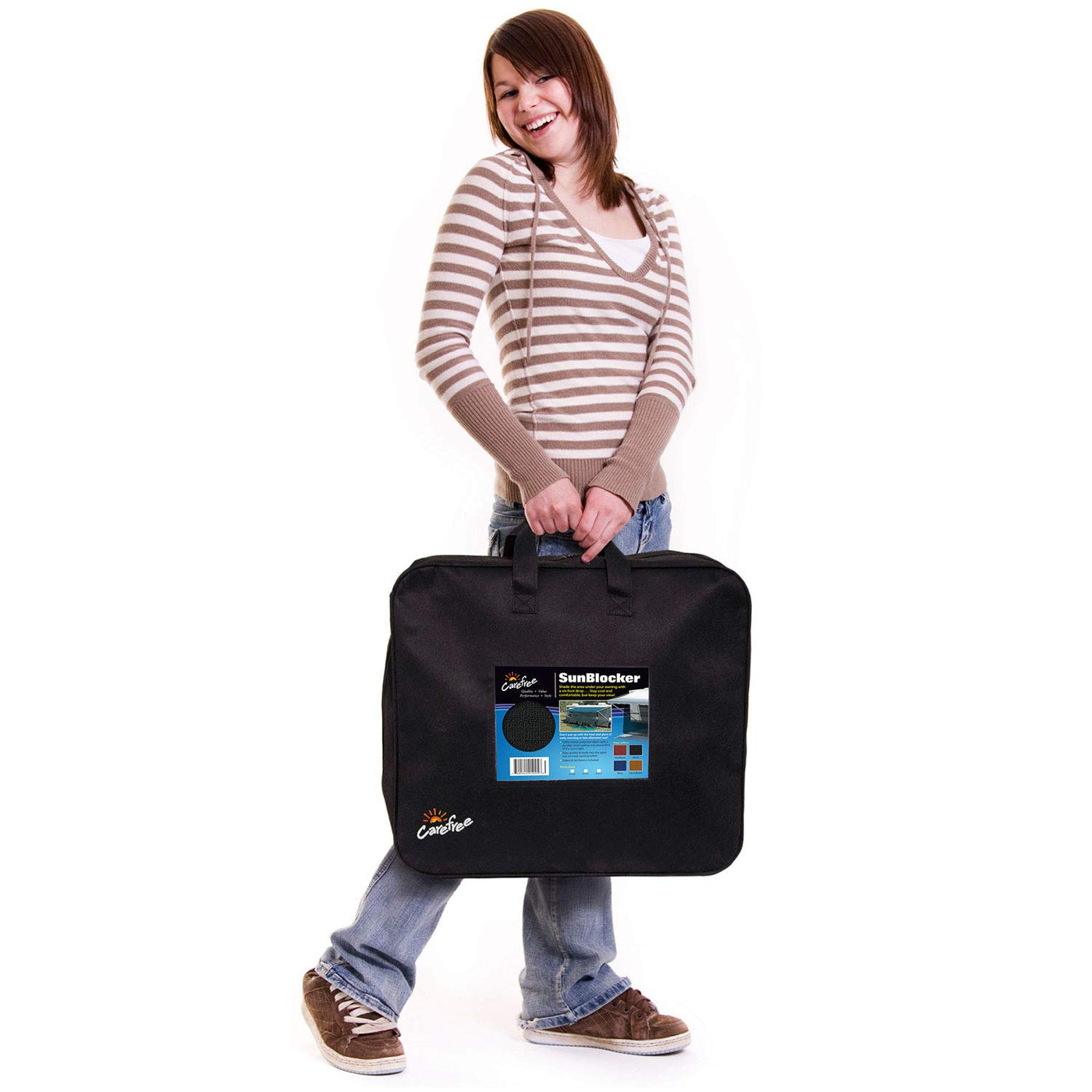 Q: Does the Carefree Sunblocker come with storage options?A: Yes, the Carefree Sunblocker includes a convenient carry and storage bag that measures 18.5 inches wide, 16 inches tall, and 3.25 inches deep, making it easy to transport and store when not in use.