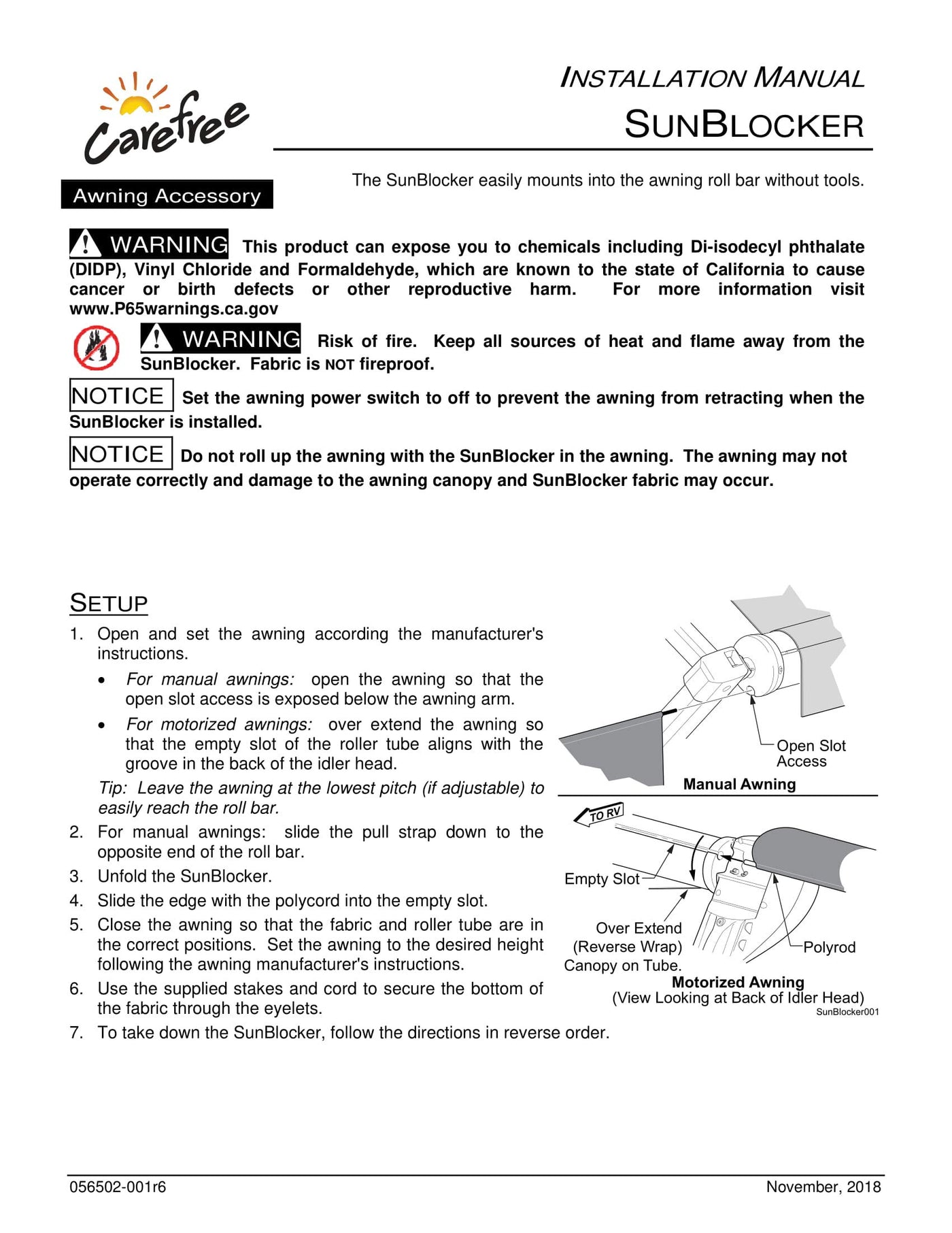 Q: Is the Carefree Sunblocker compatible with electric awnings?A: The Carefree Sunblocker is specifically designed for most RV manual awning roller tubes. For electric awnings, it is recommended to use the Carefree EZ Zip Blocker for optimal compatibility.