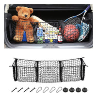 Keep your car, SUV, or pickup truck organized with our heavy-duty cargo net. Made of durable polyester, it features high elasticity for long-lasting use and comes with sturdy aluminum carabiners for secure attachment. Expandable up to 62 inches, it fits most vehicles and can be easily installed or removed without tools. Store groceries, tools, or kids ' toys securely in the 3 pocket mesh design, ensuring a tidy interior. Folds away compactly when not in use.