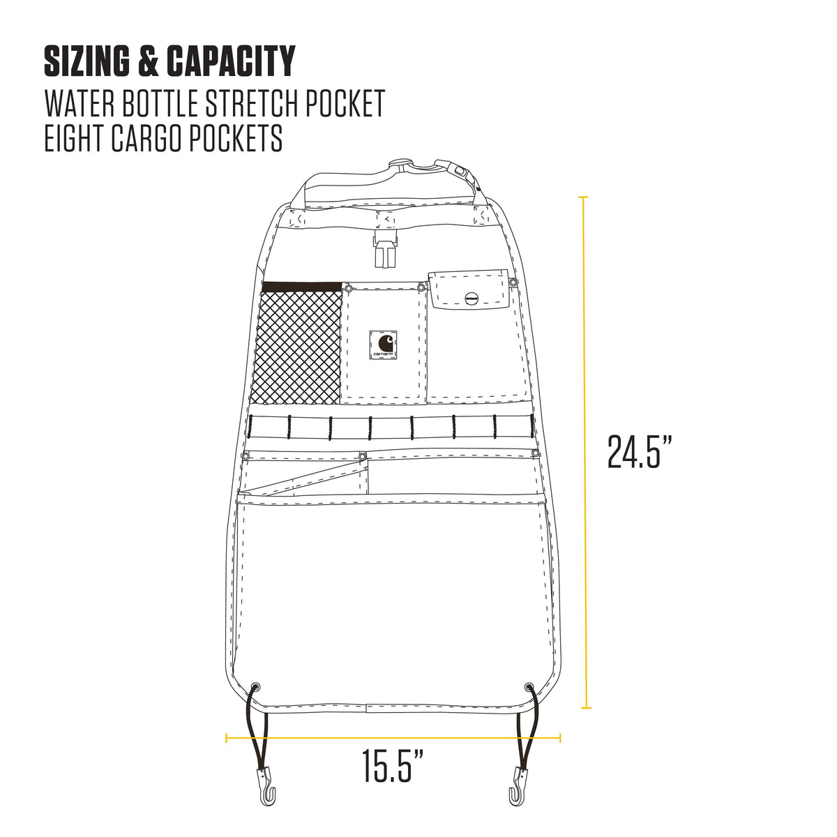 Be Ready And Stay Organized. This Organizer Attaches To The Backside Of A Seat And Combines Durable Carhartt Material With Plenty Of Storage. Its Pockets Are Ready For Nearly Anything You Need To Store On The Go, From Water Bottles To Wrench Sets To Cell Phones, And All Your Other Odds And Ends. When The Pockets Get Full Utilize The Molle To Attach Extra Gear, And Hang Your Hat Up And Out Of The Way On The Hook.