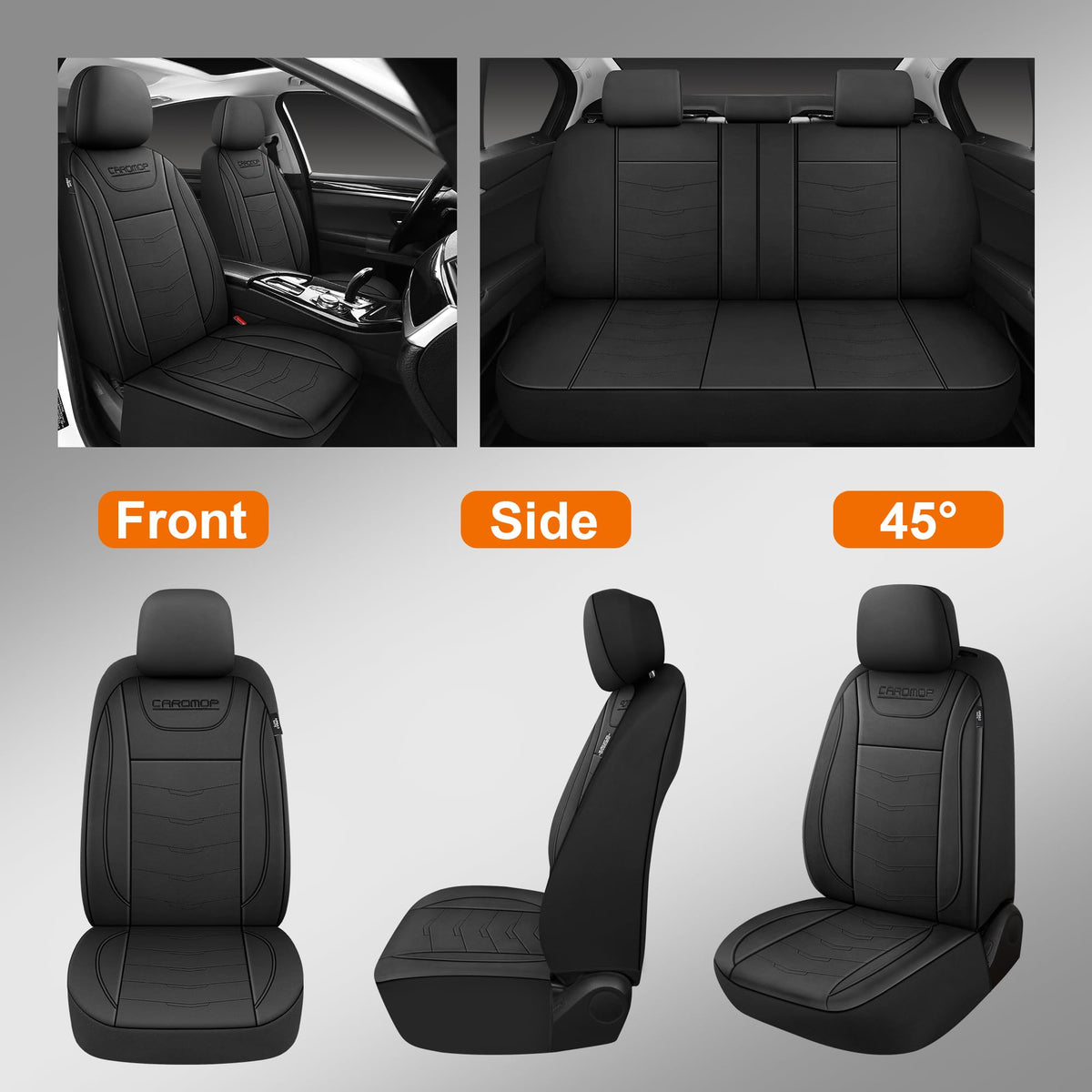 [SIMPLIFIED DESIGN]Infuse your vehicle with a unique blend of sportiness and minimalism with our Caromop Simplistic Sporty Car Seat Covers. These seat covers embody a streamlined design made of sporty lines that are simple yet captivating, transforming your car's interior into a sleek and energetic environment. | [AIRBAG COMPATIBILITY]Designed with airbag compatibility in mind. Our seat cover is crafted to work effectively with most airbag systems, prioritizing safety. With its smart fit design, it contours to your car seats for a snug and secure fit. | [SEPARATE DESIGNOUR] Split rear seat cover, The cover is divided into two parts, perfect for accommodating different seat configurations. The highlighted feature is the zipper unlocking mechanism for the center armrest, allowing convenient access and maintaining a seamless look.And the rear bench covers fits 40/60, 50/50, 60/40 spilit bench either. | [EASY-INSTALL]Acknowledging the inconvenience often associated with the need to cut the rear seat cover for safety buckle fitting, we have taken proactive steps to circumvent this issue. Each seat cover in our range comes with prearranged spots for the safety buckles, which simplifies the installation process significantly for you.To further enhance your user experience, we also provide detailed installation instructions as well as an informative installation video guide. | [UNIVERSAL ADAPTATION] Universal fit car seat covers, designed to fit a variety of vehicles including sedans, trucks, SUVs, and even commercial vehicles. Made from high quality materials, If you're unsure whether our seat covers are compatible with your vehicle, our team is here to assist you in confirming the fit.