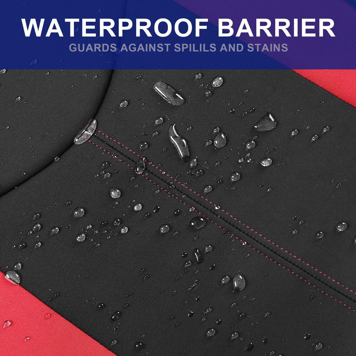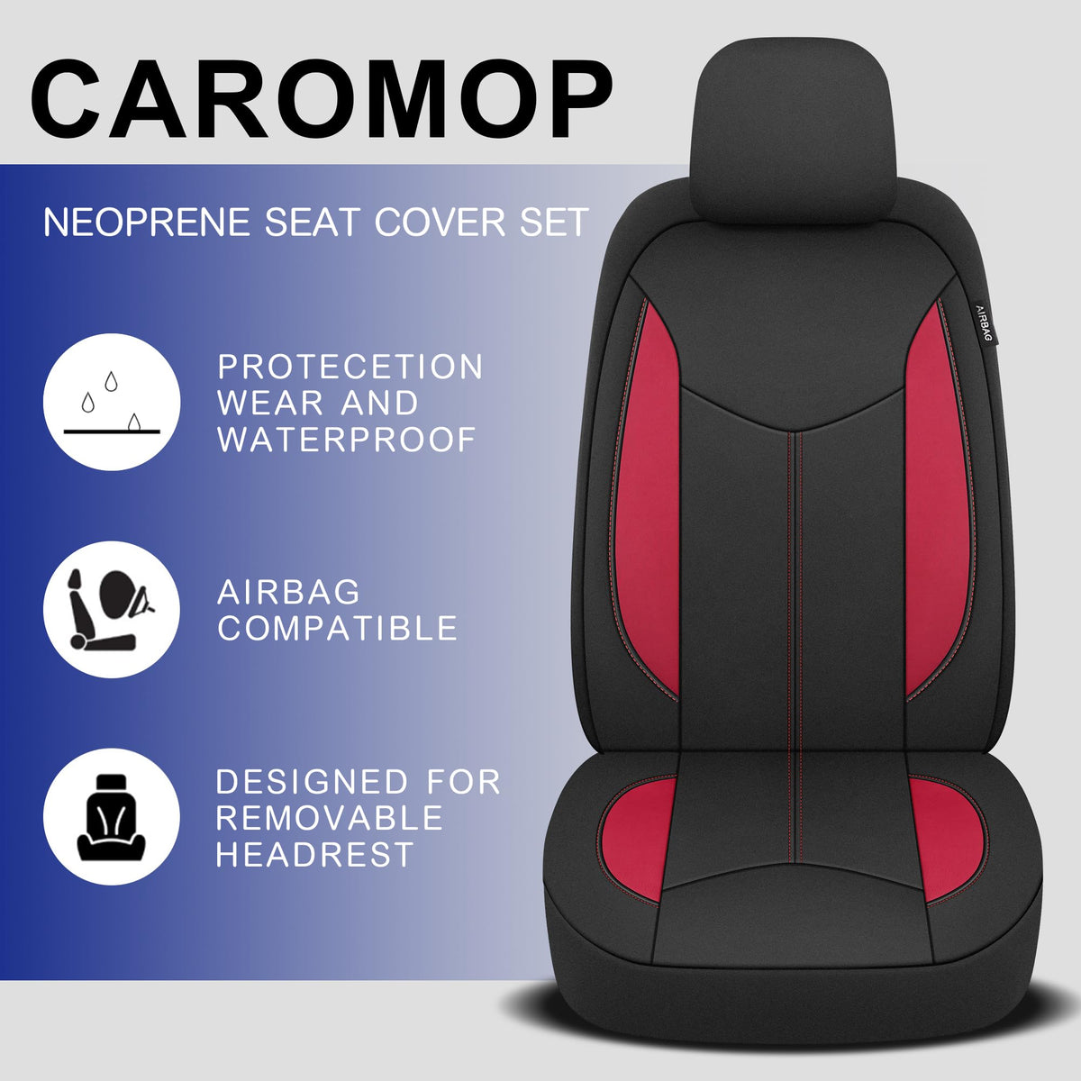 Q: Are the CAROMOP Neoprene Car Seat Covers waterproof?A: Yes, the CAROMOP Neoprene Car Seat Covers are made from a waterproof fabric and high-quality chloroprene rubber, providing excellent protection against spills and moisture.