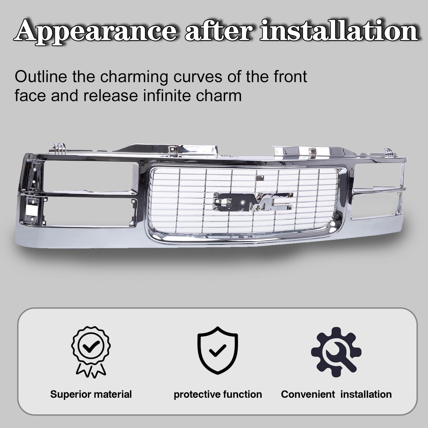 Item SpecificationsPlacement On Vehicle - FrontColor / Finish - CHROMEWarranty - 1 YearFitment DetailsCompatible with GMC1997 C1500 Sierra GT1994-1997 C1500 Sierra SL1994-1997 C1500 Sierra SLE1994-1997 C1500 Sierra SLT1994-1997 C1500 Sierra Special1994-1997 C2500 Sierra SL1994-1997 C2500 Sierra SLE1994-1997 C2500 Sierra SLT1994-1997 C3500 Sierra SL1994-1997 C3500 Sierra SLE1994-1997 C3500 Sierra SLT1994-1997 K1500 Sierra SL1994-1997 K1500 Sierra SLE1995 K1500 Sierra SLS1994-1997 K1500 Sierra SLT1994-1997 K1500 Sierra Special1994-1997 K2500 Sierra SL1994-1997 K2500 Sierra SLE1994-1997 K2500 Sierra SLT1994-1997 K3500 Sierra SL1994-1997 K3500 Sierra SLE1994-1997 K3500 Sierra SLT