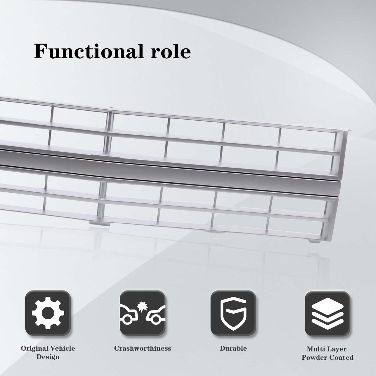 Q: What material is the front grille made of?A: The front grille is made of high-quality plastic, ensuring durability and longevity for your vehicle.