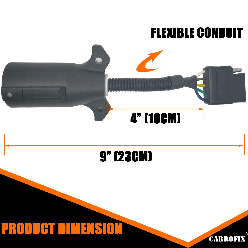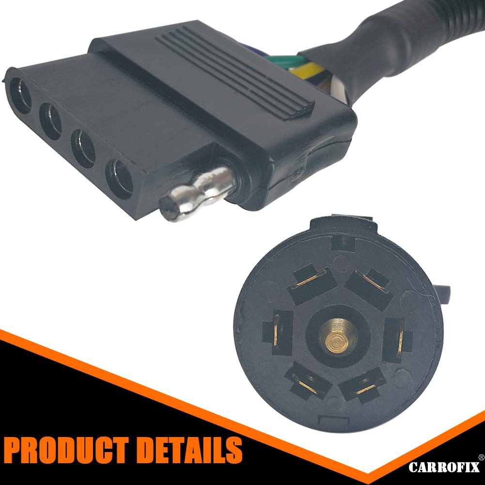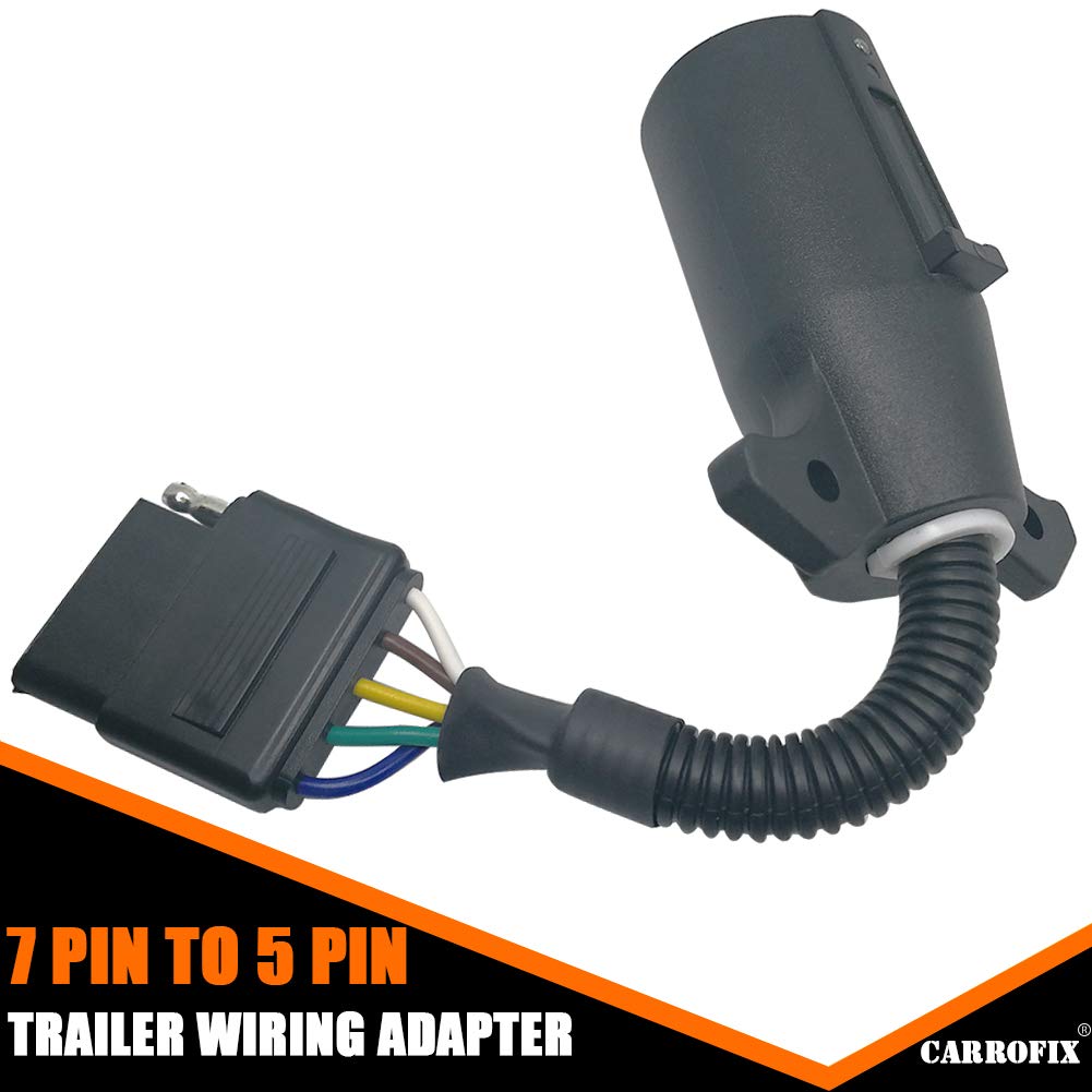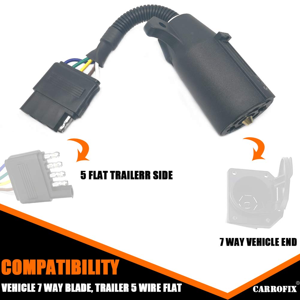 Carrofix Trailer Light Wiring Adapter - 7-Way Round To 5-Flat Female This Well Made Wiring Adapter Is Compatible With A 7-Way Rv Blade Trailer Socket On The Vehicle, And Adapts To Work With The 5-Way Flat Connector On The Trailer. Designed To Match The Vehicle And Trailer Connection, This Adapter Mates A 7-Way Round Vehicle Plug To A 5-Way Flat Trailer Receptacle Without Having To Splice Into The Wiring System. Specifications: Item Name: 7 To 5 Pin Trailer Adapter Material: Plastic Center Wire Length: Approx. 8.8-Inch