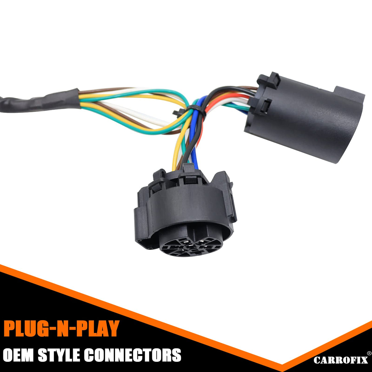 Q: What features ensure the durability of this wiring harness?A: The CARROFIX wiring harness is constructed with durable materials, including a spring-loaded lid that keeps the socket clean when not in use, and a black sealed tubing wire conduit that protects against wear and bad weather.