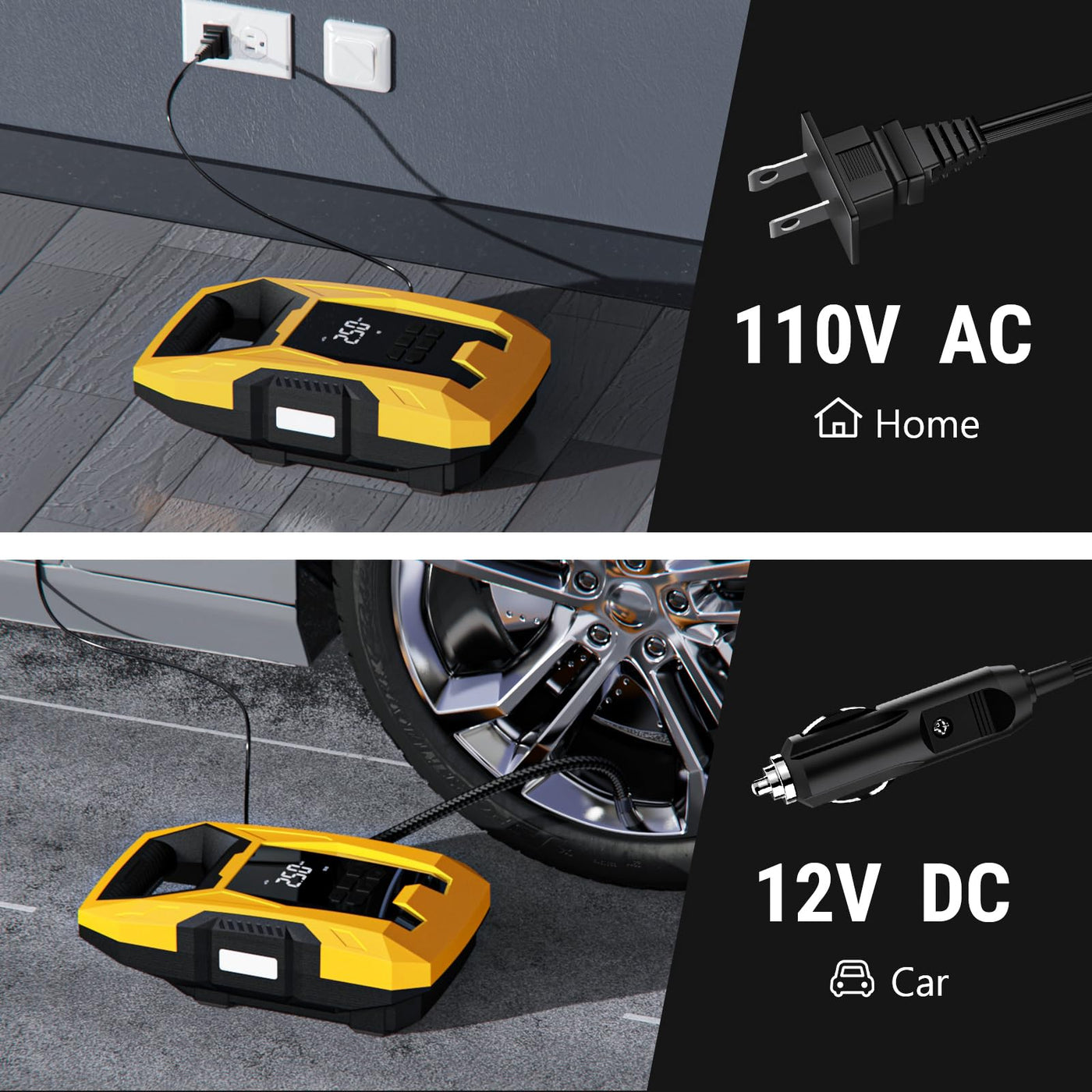 Why Choose The Carsun Ac/Dc 2-In-1 Tire Inflator? Uncompromised Safety: Getting Flattires While On The Road Is A Nightmare For Drivers. The Carsun Digital Tire Inflator Helps Get You Back On The Road Safely And Quickly With Its Smart And Easy-To-Use Tire Inflation Function. You Dont Have To Wait For Help To Arrive When You Know You Can Fix The Tire Problem Yourself With The Right Equipment. It Also Helps You Save On Fuel By Preventing Driving With Uneven Tire Wear. Its Your Must-Have Safety And Efficiency Partner On The Road Anytime,Anywhere! Works With Multiple Vehicles: Carsun Air Pump Covers Different Car Sizes And Types, From Compact Sedans To Suvs. Its 10Ft Cord Is Long Enough To Reach All Four Tires.Its Powerful Engine Can Pump Up To 150Psi Enabling It To Capably Fill Car Tires In Very Little Time. Notice: * The Car Air Pump Only Works With 12V Dc Or 110V Ac Power Source. * The Car Air Pump Is Not Applicable To Truck Tires. Intelligent Multi-Function: The Carsun Portable Air Compressor Smartly Incorporates A Led Flashlight, Tire Pressure Gauge And Tire Inflator In One User-Friendly Device To Ensure And Maximize Your Safety.