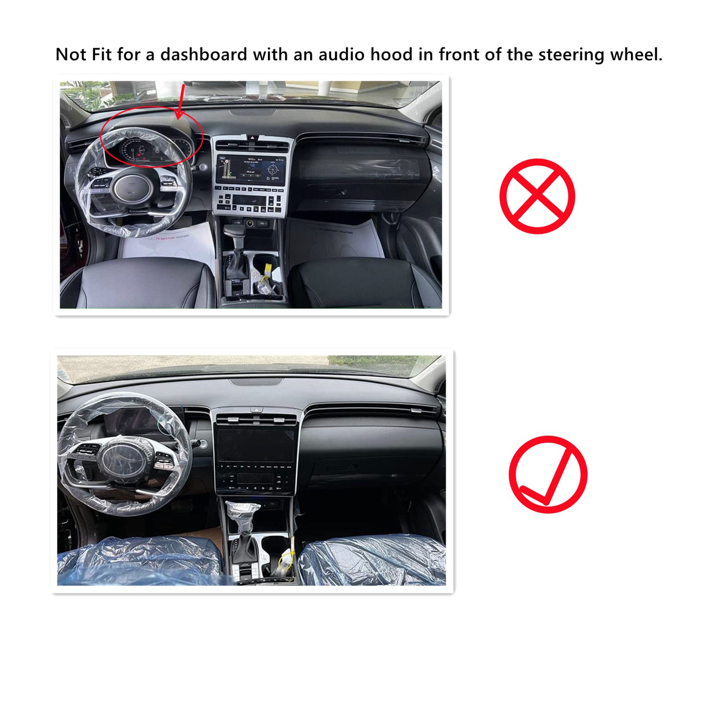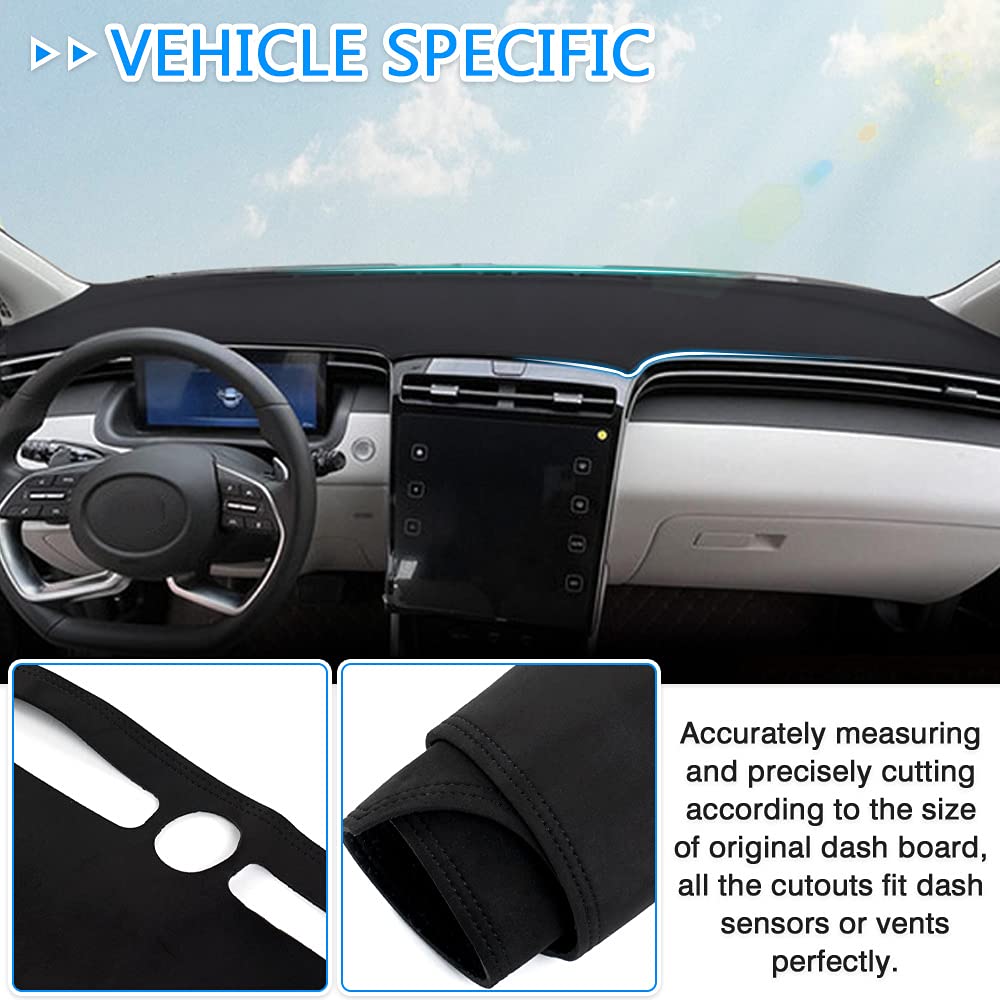 NOTICE -- ?? Not fit for a dashboard with an audio hood in front of the steering wheel! Custom-made for Tucson 2022 2023 & Santa Cruz 2022 2023 2024? With Speaker?. All vents and sensor openings pre-cut for a factory finish look. | Anti-slip -- Soft and elegant-looking high-quality suede materials featuring durable, odorless and non-toxic while improving the interior look of your car. Non-slip backing system design works well to make it firmer placed. | Necessary Accessories for Tucson -- A great way to protect your vehicle