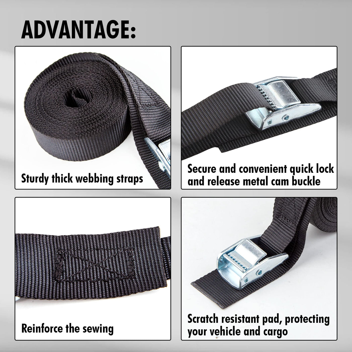 Q: How do I use the adjustable cam buckle on these lashing straps?A: To use the adjustable cam buckle, simply thread the strap through the buckle, pull it to tighten, and then lock it in place. This allows for a secure and customizable fit for your cargo.