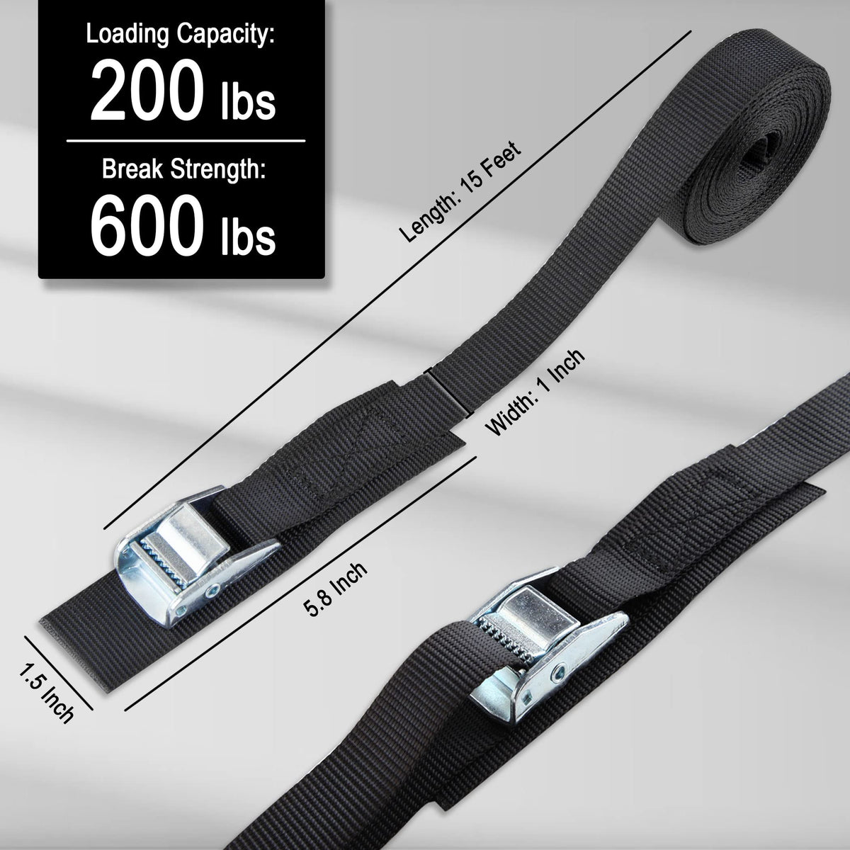 Q: What are the dimensions of the Cartman Lashing Straps?A: The Cartman Lashing Straps are 1 inch wide and 15 feet long, making them ideal for securing various cargo sizes.