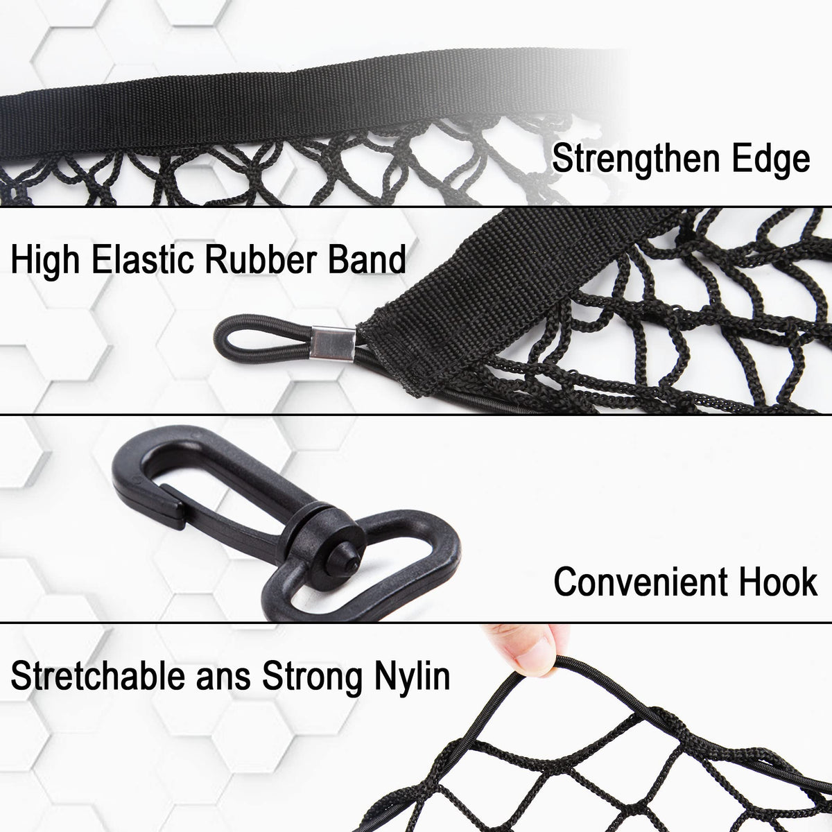 Q: How do I install the Cargo Net Hammock in my vehicle?A: Installation is simple; the hammock comes with 4 self-locking hooks that attach to the mounting points in your vehicle’s rear cargo area. All necessary mounting hardware is included for easy setup.