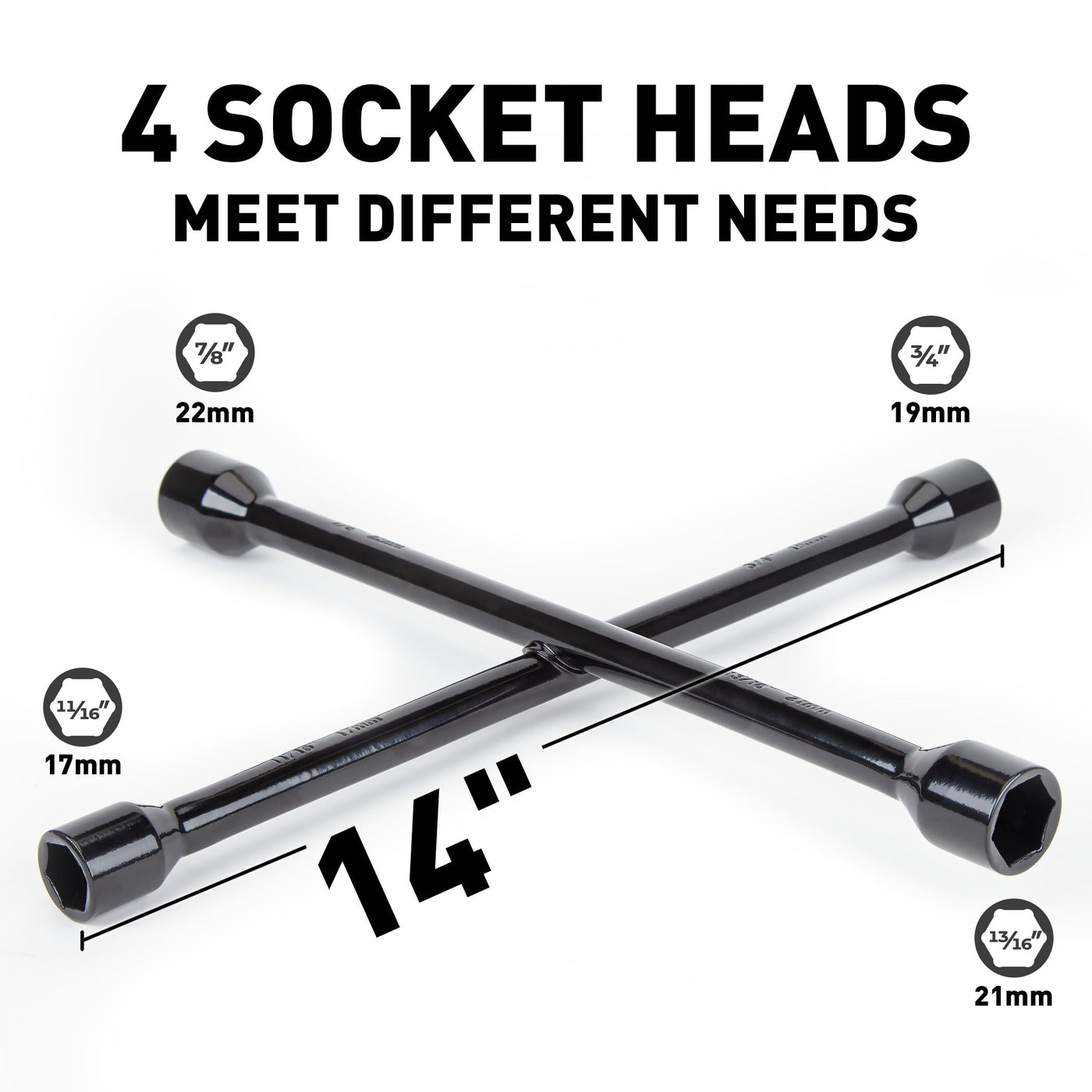 Q: What sizes of lug nuts does the CARTMAN 14 Inch Lug Wrench fit?A: The CARTMAN Professional 14 Inch Universal Heavy Duty Lug Wrench is designed to accommodate most common SAE and metric lug nut sizes, including 11/16", 3/4", 13/16", and 7/8"; equivalent to 17mm, 19mm, 21mm, and 22mm.